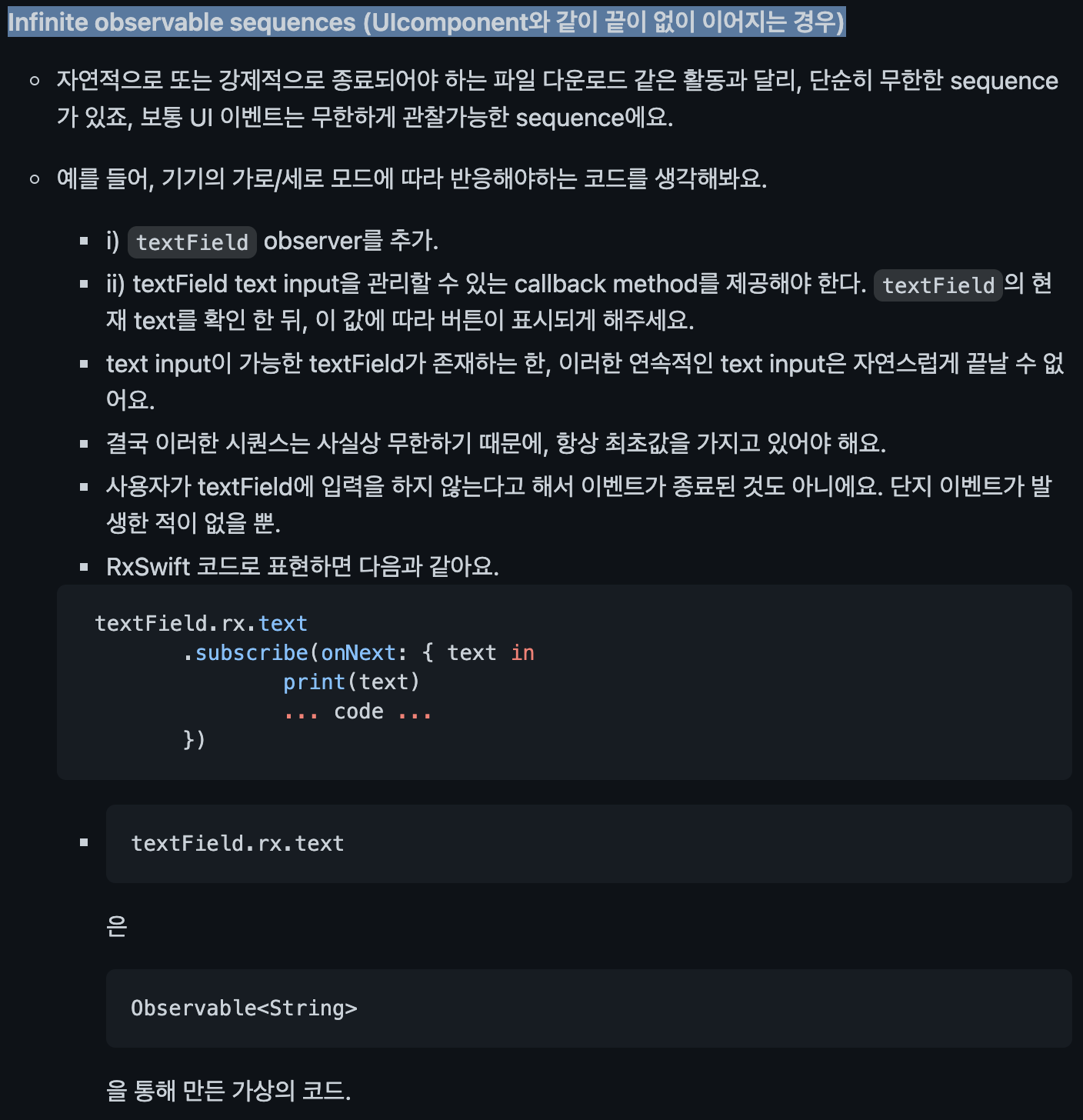 - Infinite observable sequences (UIcomponent와 같이 끝이 없이 이어지는 경우)
