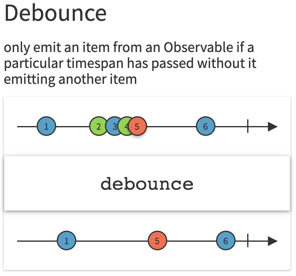 - 어떤 이벤트가 발생하면 일정한 딜레이를 갖는데, 그 사이에 또 다른 이벤트가 들어오면 다시 딜레이가 초기화되고, 딜레이 안에 어떤 값도 들어오지 않으면 그 마지막 이벤트만을 방출한다.