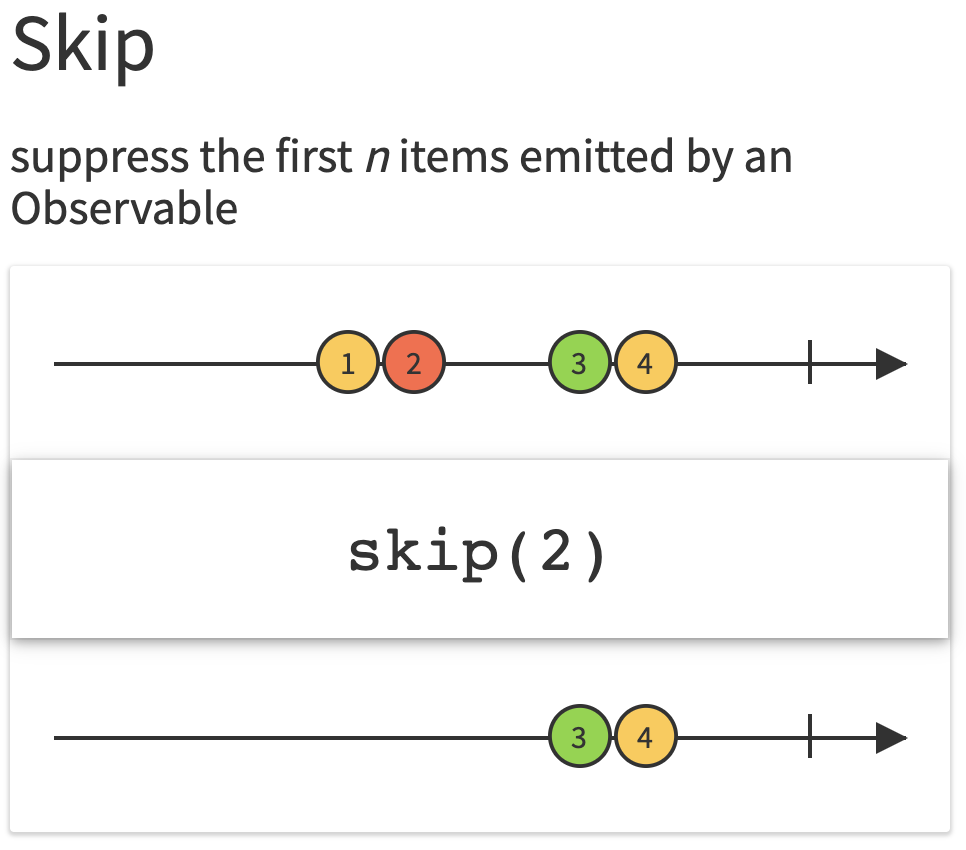 - skipUntil : 특정 이벤트 발생 후 그 시점부터 방출함. 그전까지 모두 스킵