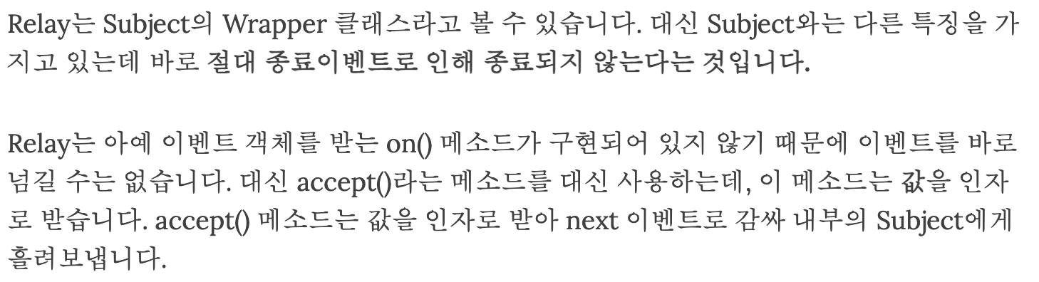 - 아직까지는 rx를 사용해서, subject나 relay를 가지고 코드를 작성하는 것이 기존의 delegate를 이용한 코드보다 직관적으로 느껴지지 않는다.