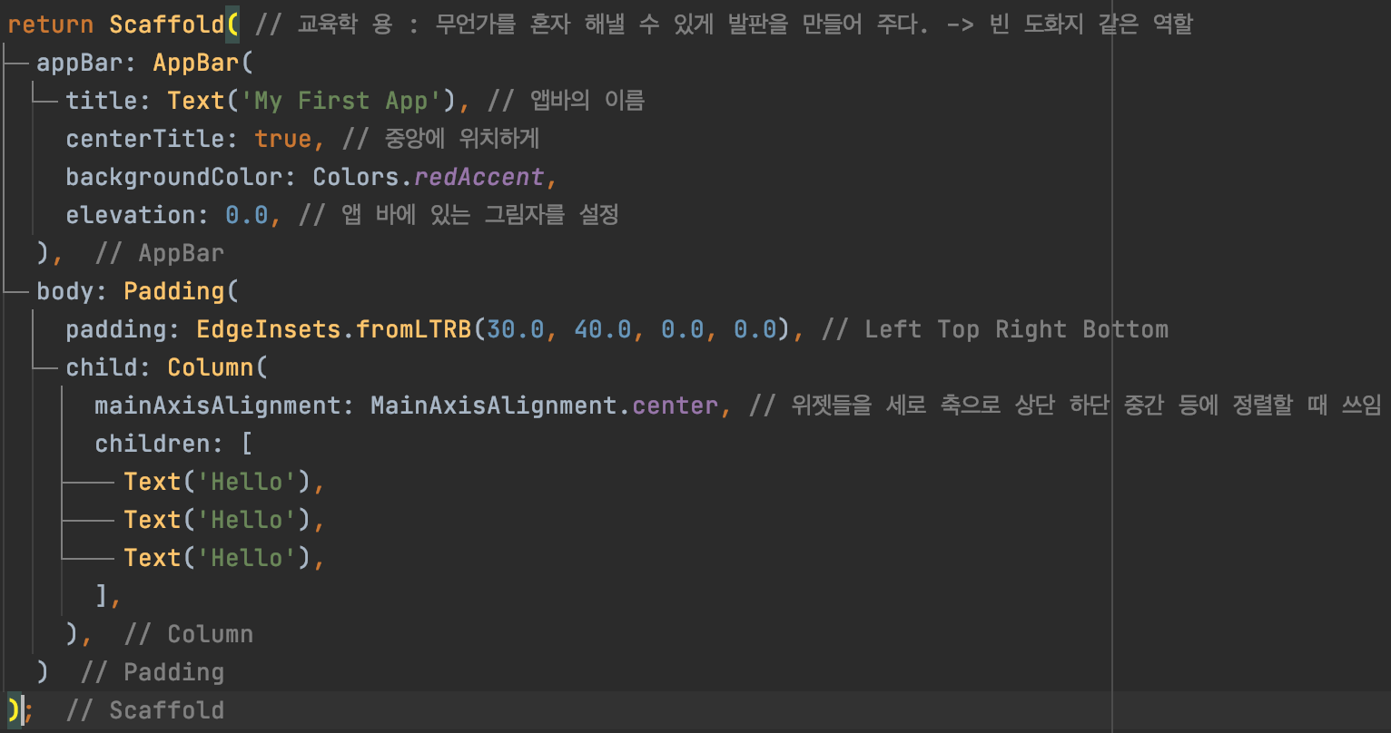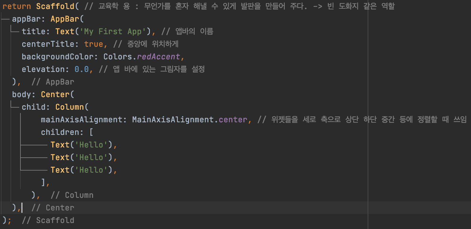//mainAxisAlignment: MainAxisAlignment.center, // 위젯들을 세로 축으로 상단 하단 중간 등에 정렬할 때 쓰임