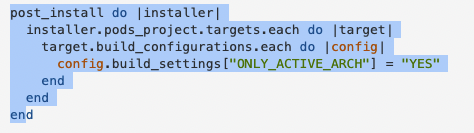 post_install do |installer| installer.pods_project.targets.each do |target| target.build_configurations.each do |config| config.build_settings.delete 'IPHONEOS_DEPLOYMENT_TARGET' config.build_settings['ONLY_ACTIVE_ARCH'] = 'NO' end end end