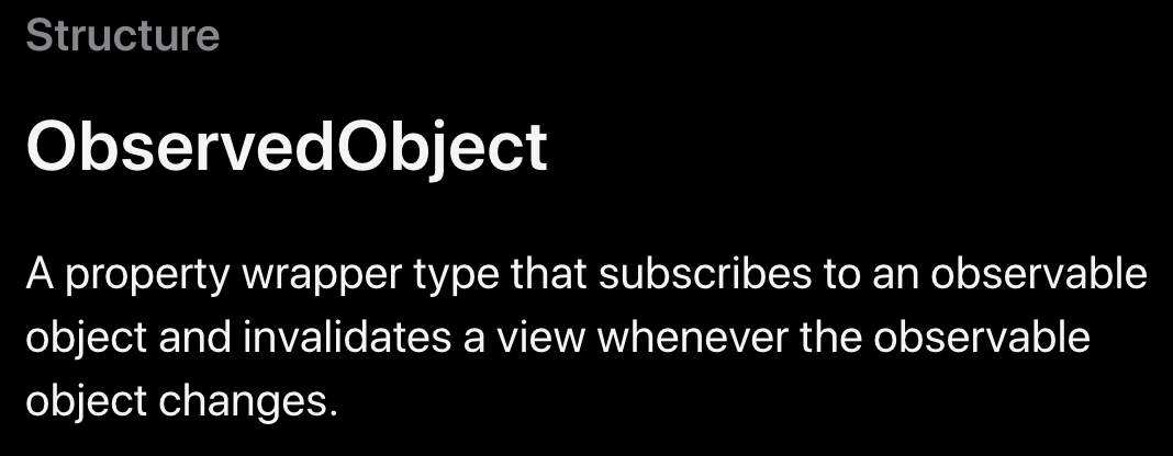 - SwiftUI는 @ObservedObject를 통해 view가 외부 객체를 감지할 수 있게 해줌.