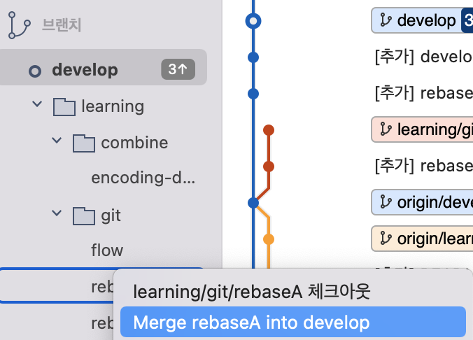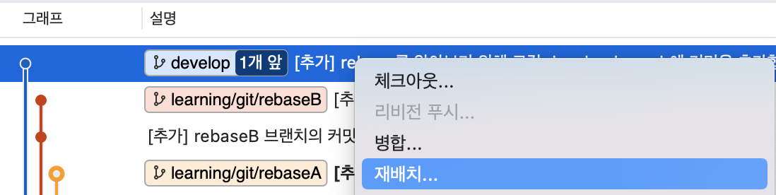 - 이후에 rebaseA를 붙이고 싶은 장소(develop)를 우클릭하여 재배치를 클릭합니다.