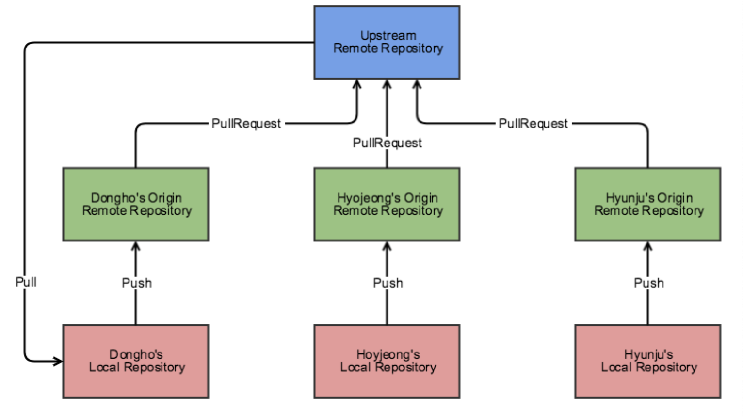 - Upstream Repository이란 모든 개발자들이 공유하는 저장소로 최신 소스코드가 저장되어 있는 원격 저장소