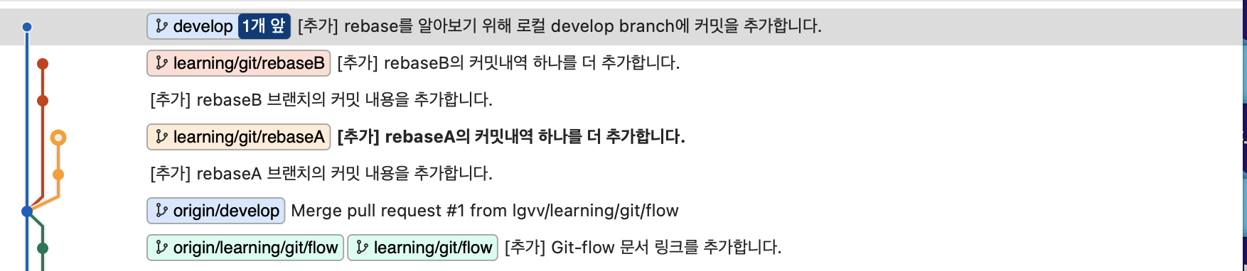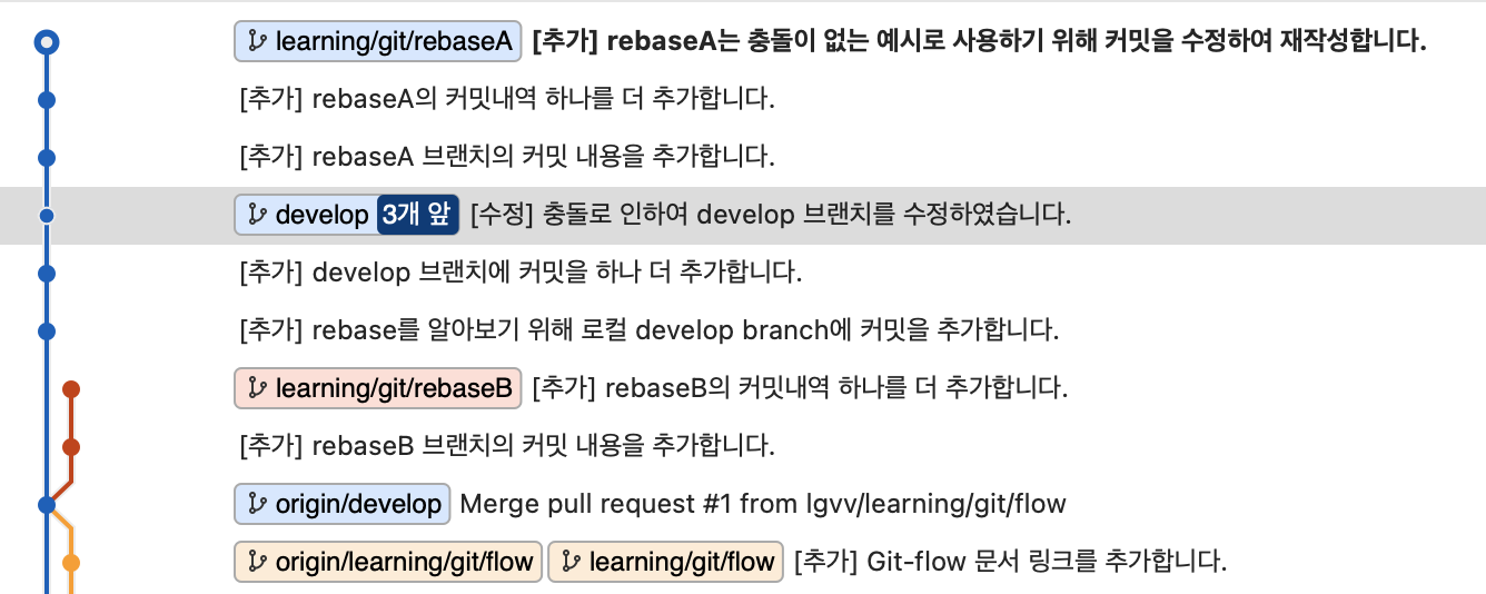 - 작업의 타임라인은 rebaseA -> rebaseB -> develop 순서.