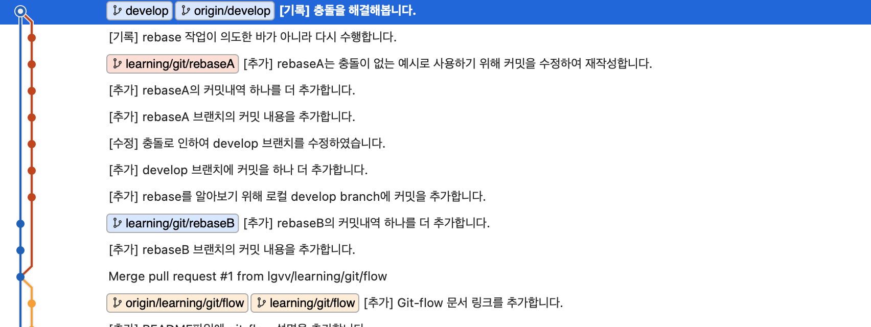 - 충돌을 해결하려고 했는데, 결국은 develop 브랜치와 rebaseA가 같은 파일에서 수정을 가해서 발생한 문제