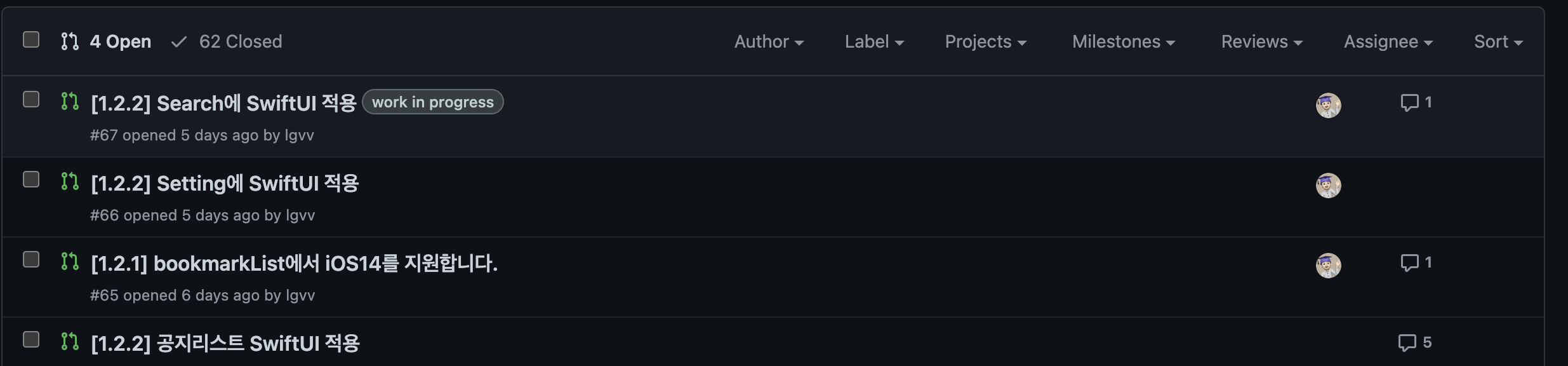 - 개인적으로는 작업 중간 진행상황을 공유하고자 미리 PR을 열어두고 Label를 활용