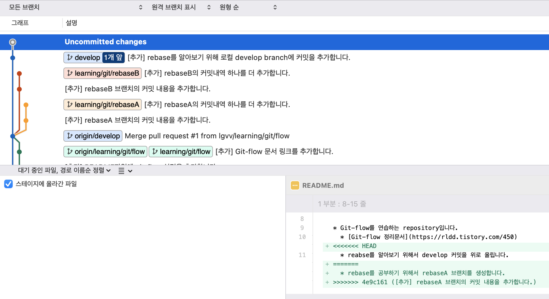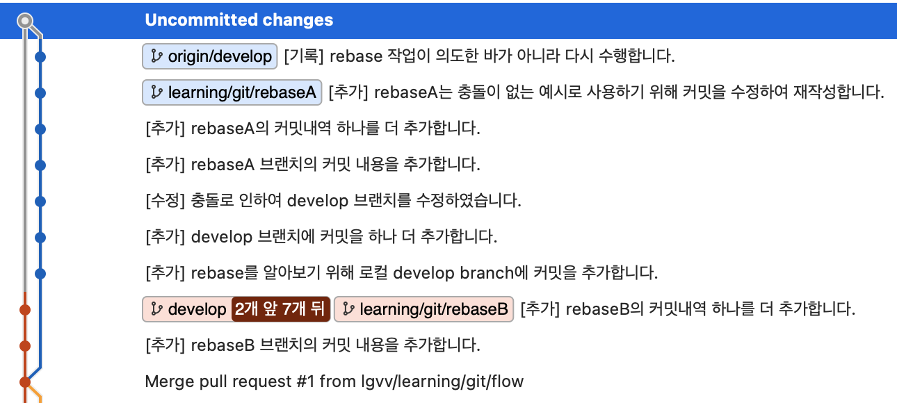 - 현재 Uncommitted changes가 되어 있는 이유는 rebase(재배치)를 하려고 했으나 충돌이 났기 때문