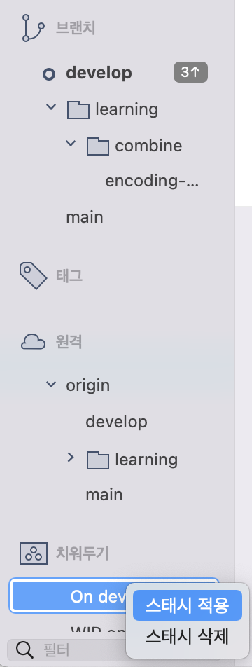 - 소스트리 우측 상단에 있는 스태시를 클릭해서 스태시(치우기)