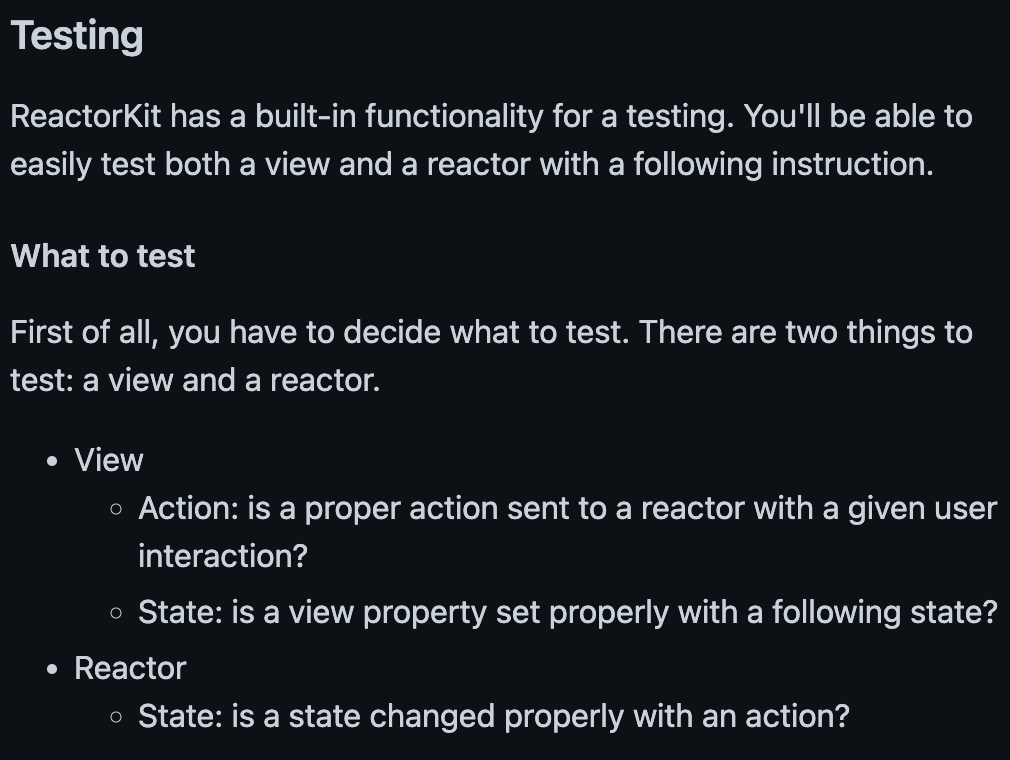 ReactorKit의 경우에는 테스트를 위한 함수가 내장되어 있어서, 손쉽게 View와 Reactor 둘 다 테스트 가능.