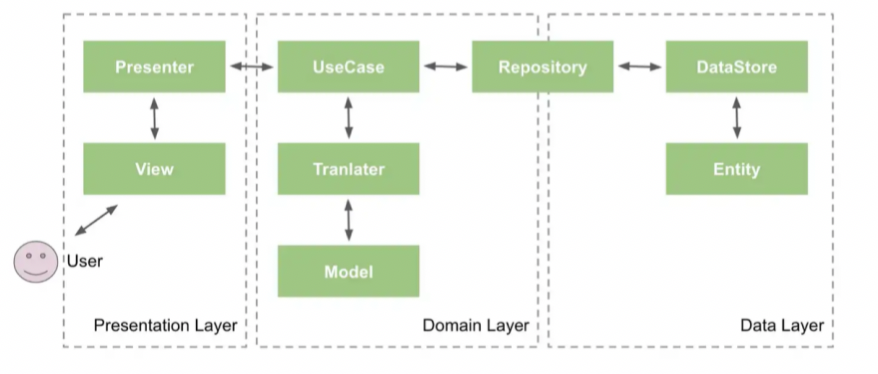일반적으로 Domain, Presentation, Data 레이어로 구성 존재