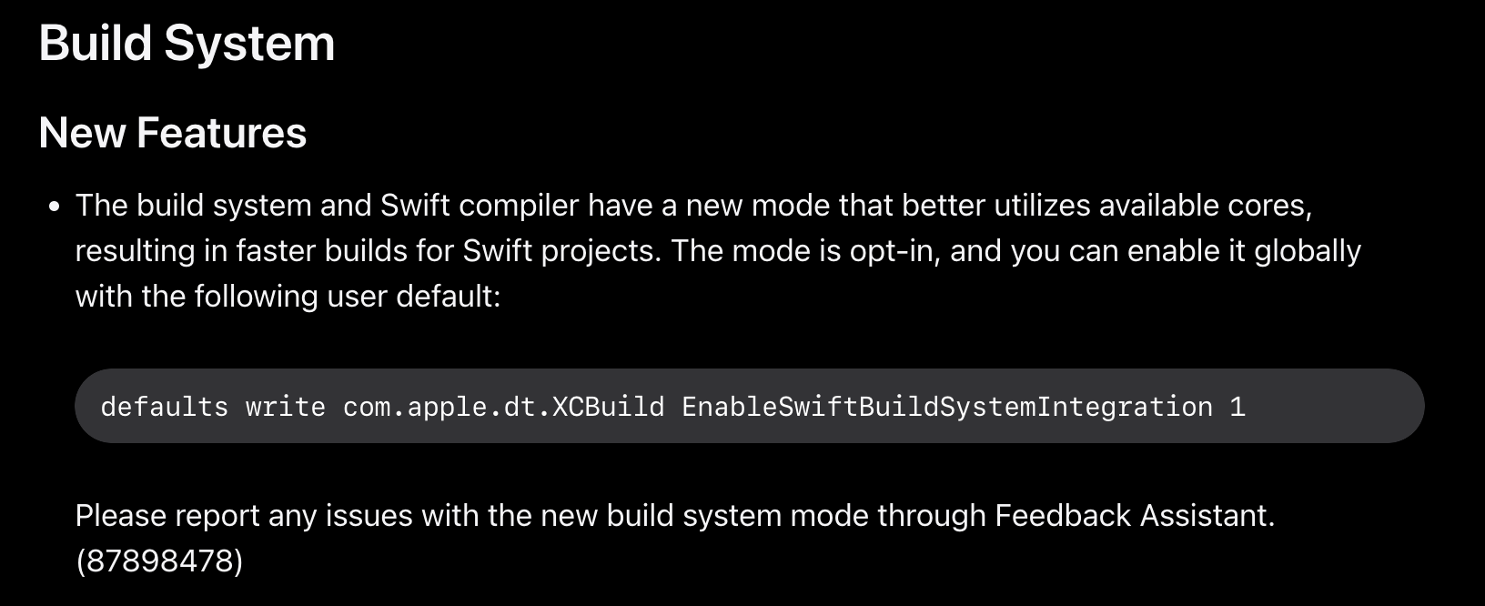 빌드 시스템과 Swift 컴파일러에는 사용 가능한 코어를 더 잘 활용하는 새로운 모드가 존재.