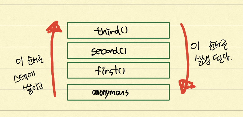 즉, third()가 먼저 실행되고, 이후 second(), first() 순서로 호출 스택이 비워짐.