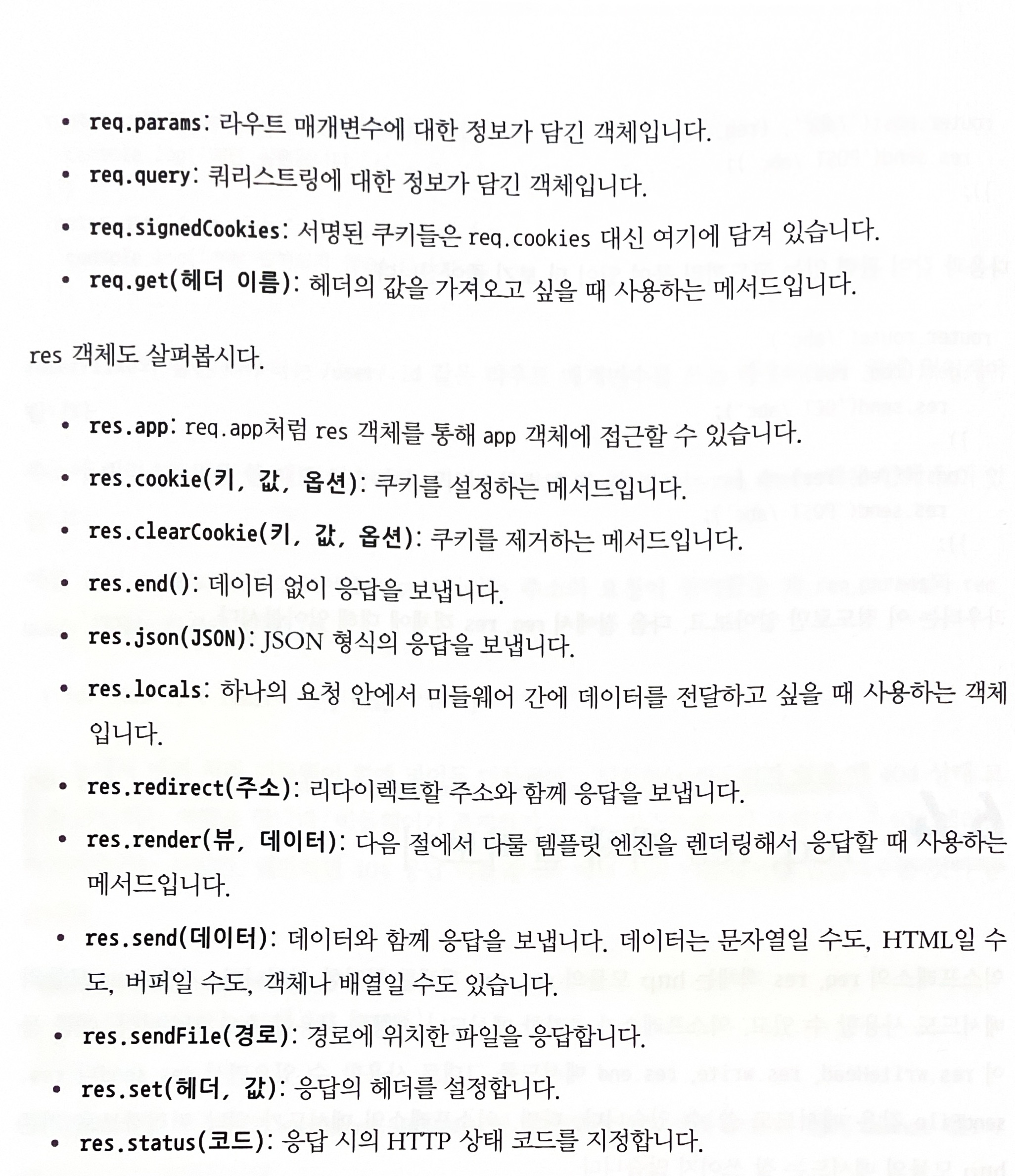 익스프레스의 req, res 객체는 http 모듈의 req, res 객체를 확장한 것이다. 기존 http 모듈의 메서드도 사용할 수 있고, 익스프레스가 추가한 메서드나 속성을 사용할 수도 있다.