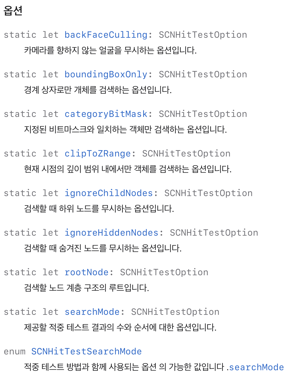 options: [SCNHitTestOption : Any]? = nil // 검색에 영향을 미치는 옵션들