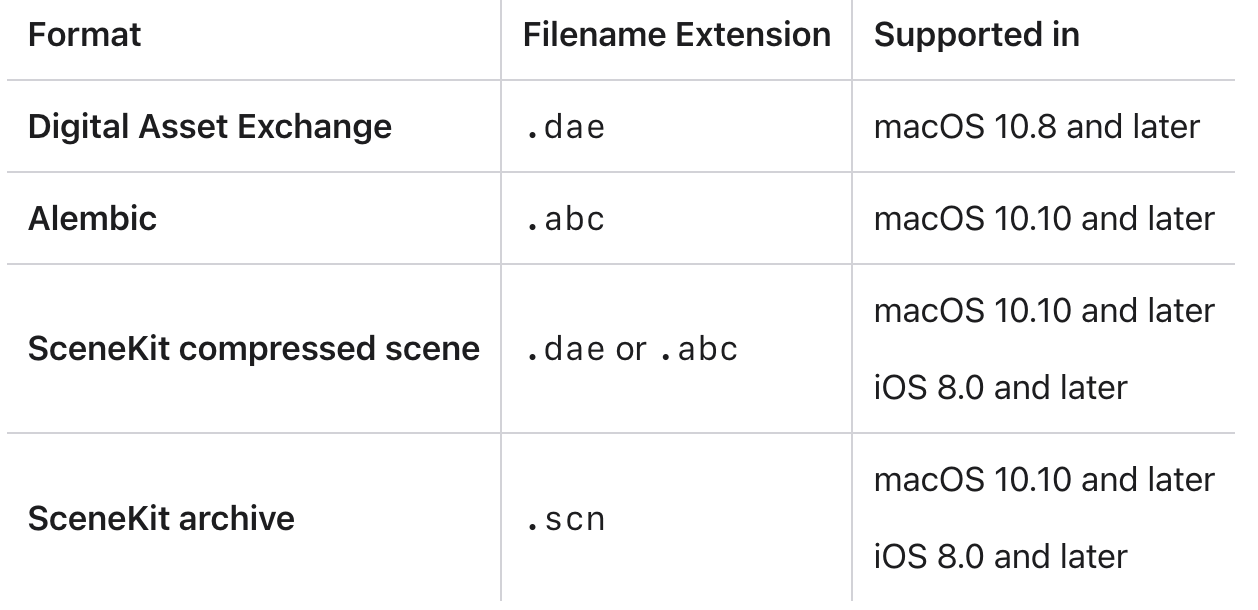 SceneKit은 지원되는 형식의 파일 또는 해당 파일의 내용을 보유한 NSData 개체에서 scene 내용을 읽을 수 있습니다. 지원되는 형식은 다음과 같습니다: