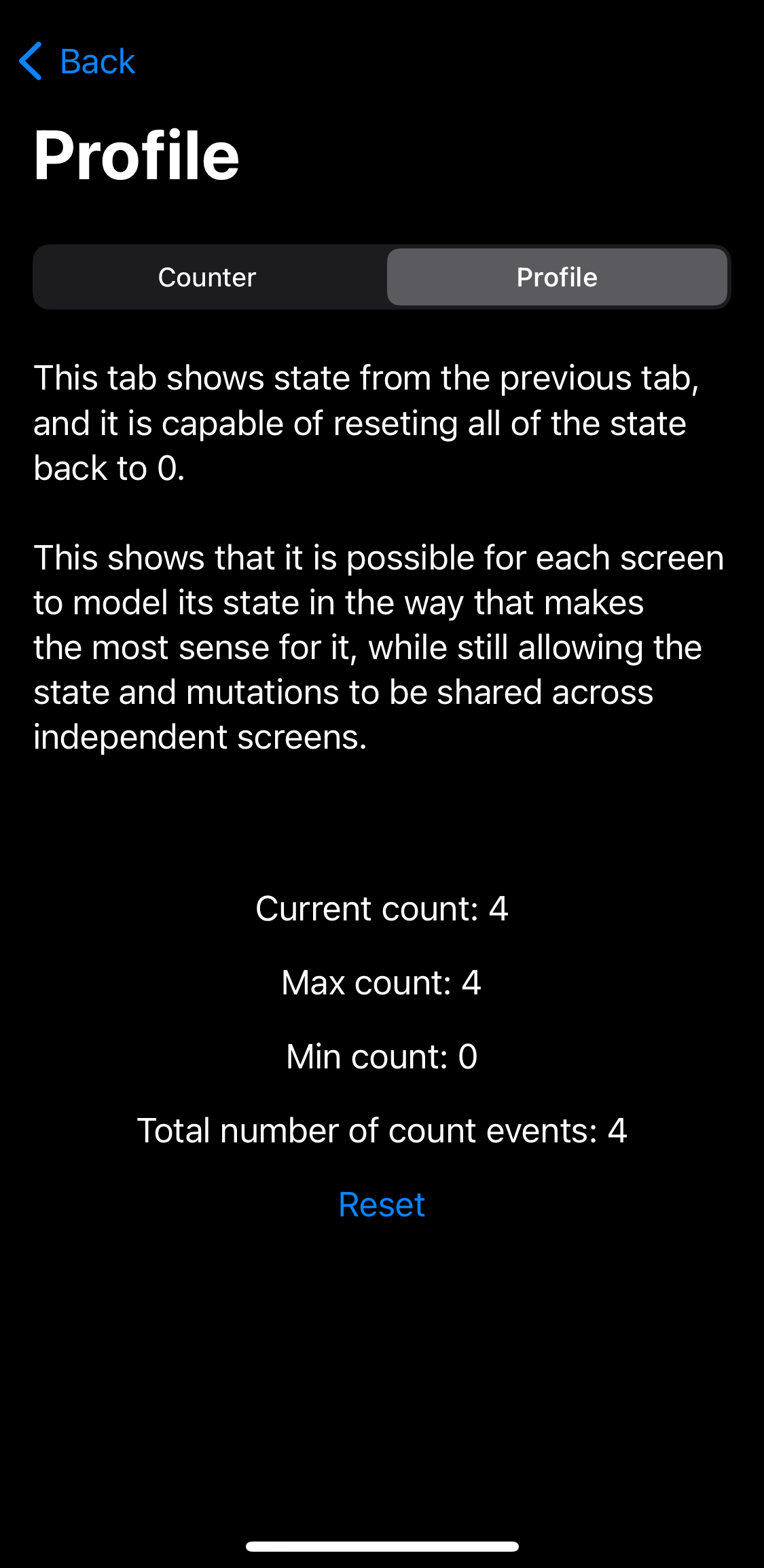 /// Profile.State는 Counter.State에서 관심있는 부분을 가져와서 설정함으로써 유도할 수 있음. 이를 통해 프로필 기능은 전체가 아닌 앱 상태의 하위 집합에서 작동할 수 있음.