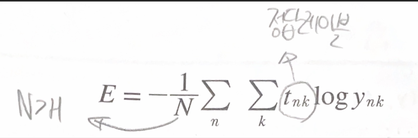 # E = -1/N * ∑ _n (∑ _k (tk * log(yk)))