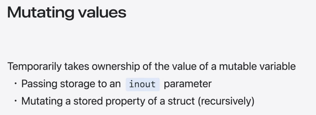 Swift는 내부적으로 호출중에 변수를 다른 방식으로 동시에 사용하는 것을 방지
