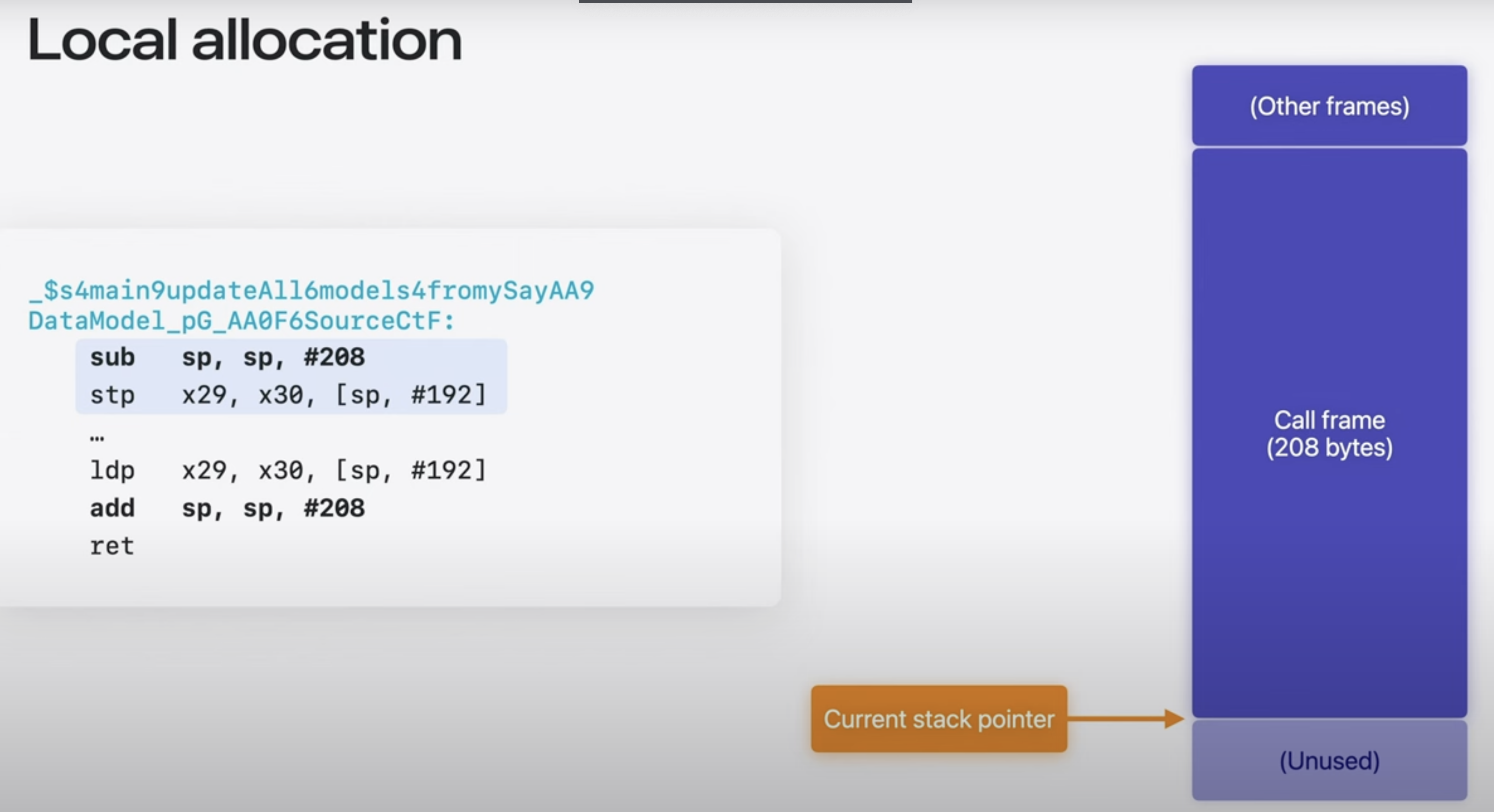 처음 시작할 때 call frame을 208 바이트만큼 할당하고 실행 가능한 공간을 제공, 이후 실행이 끝날때 208 바이트 만큼 추가해서 이전에 할당 메모리를 해제함.