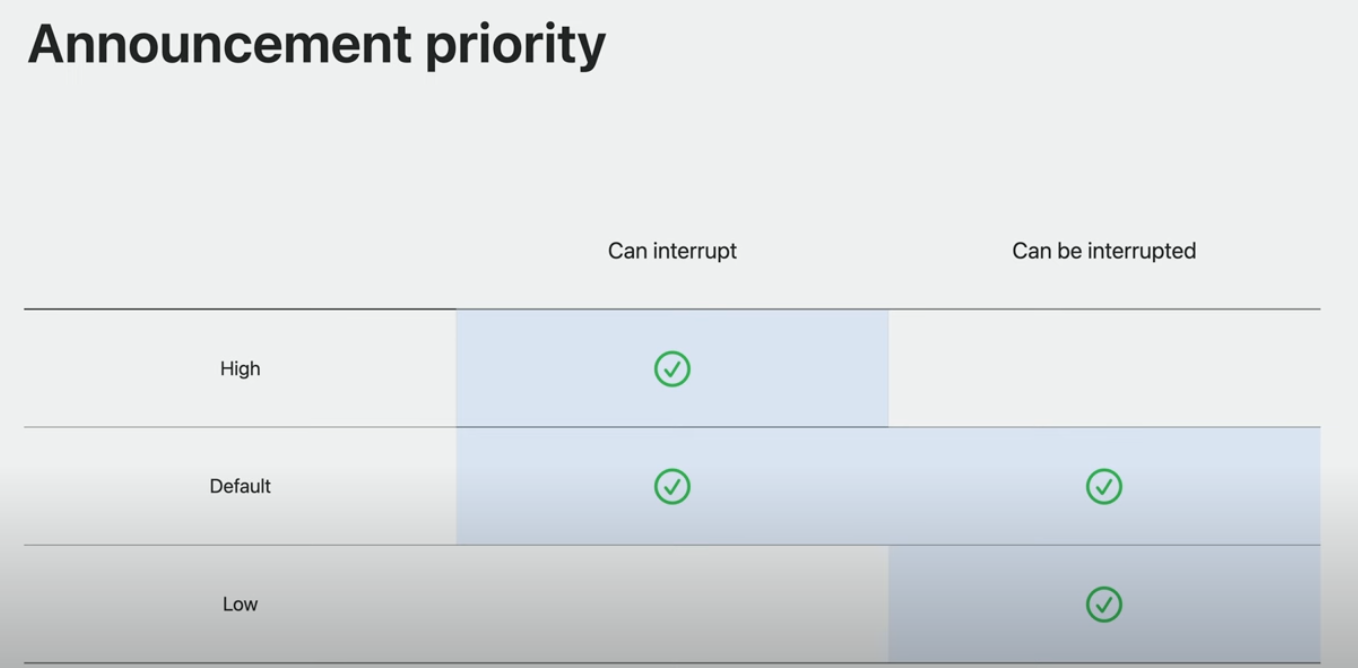 - 낮은 우선순위: 대기열에 추가되며, 다른 음성의 발화가 완료되고 다른 음성이 시작되지 않을경우 시작함.