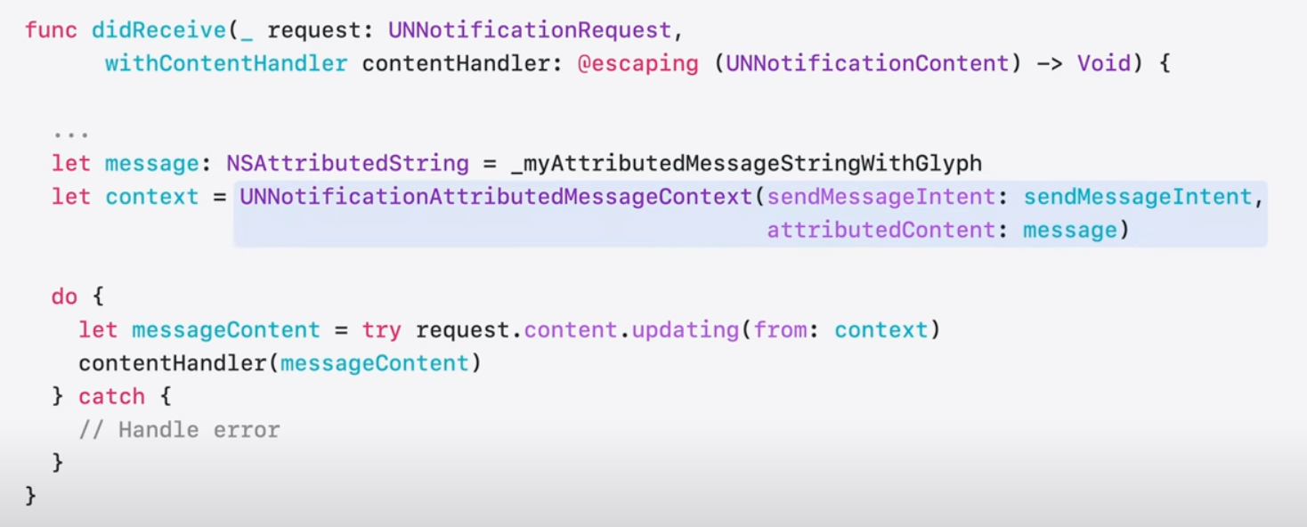 이미지 글리프가 포함된 속성 문자열에서 알림 메시지를 생성, 이를 attributeContent로 전달하여 컨텍스트를 생성하기만 하면 됨.