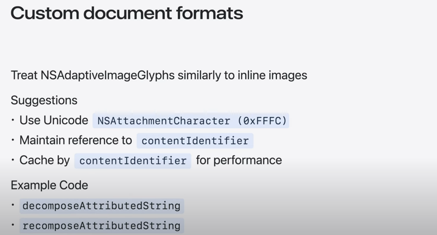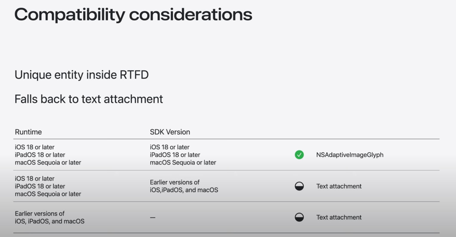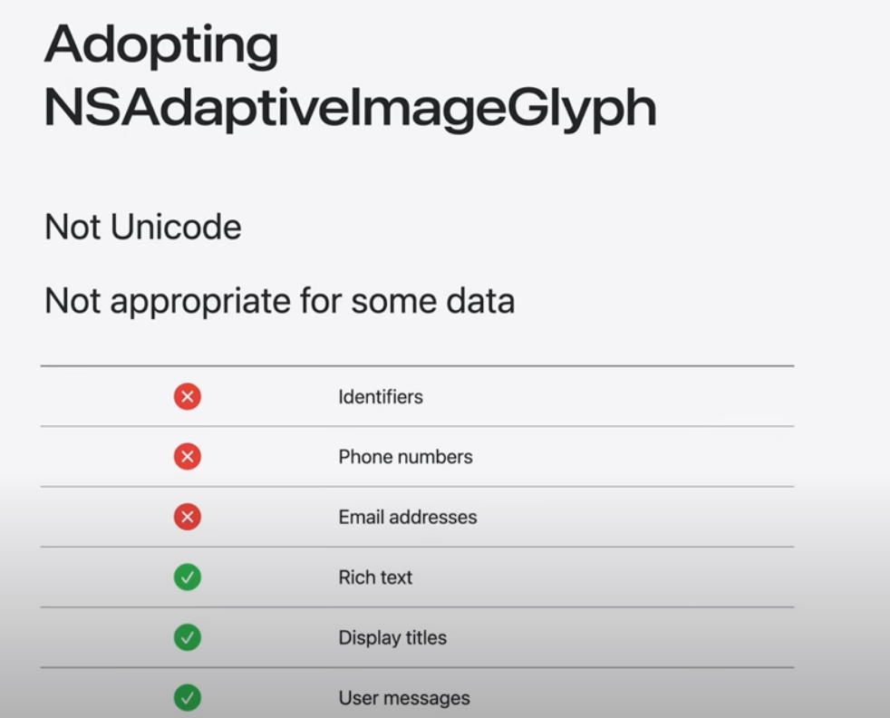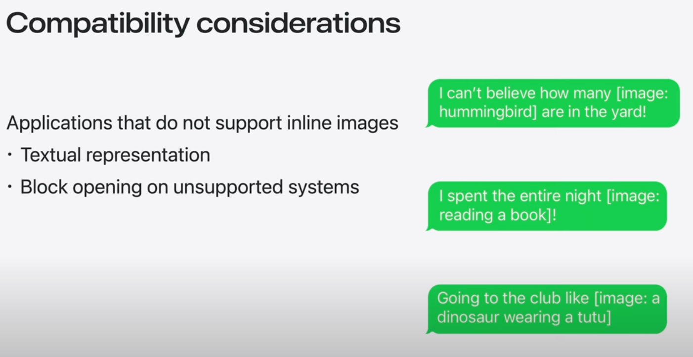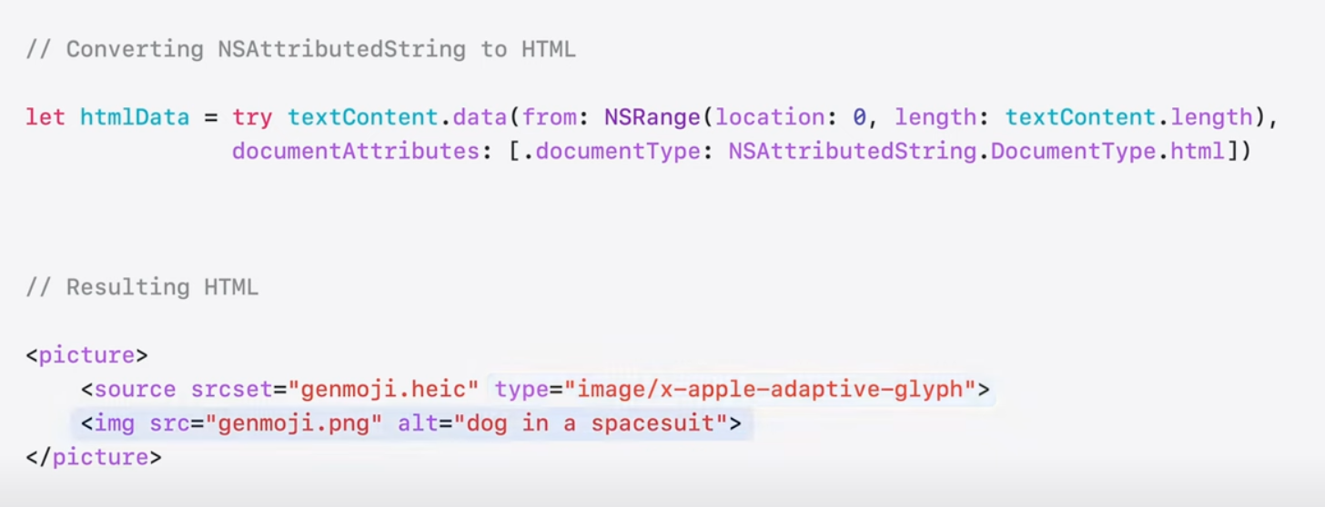 콘텐츠 편집이 가능한 WebView 및 SwiftUI 텍스트를 포함한 모든 Apple 플랫폼에서 기존 UI 텍스트 및 요소의 이미지 문자 모양을 지원하는 것 외에도 TextKit 및 CoreText와 같은 기존 Apple 프레임워크로 구축된 사용자 정의 텍스트 엔진은 업데이트 된 텍스트 렌더링 API를 활용해 제공할 수 있음. Genmoji를 위한 맞춤형 솔루션 제공 가능.