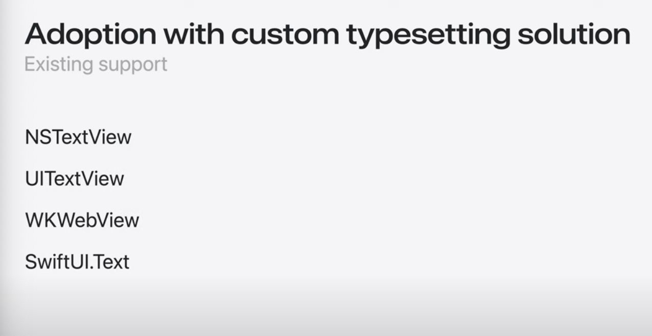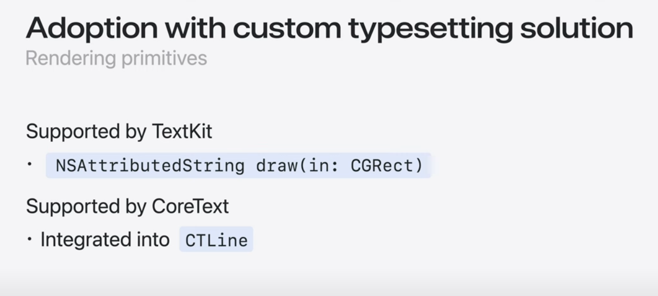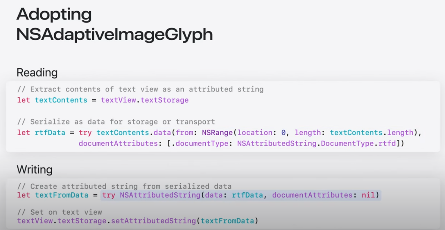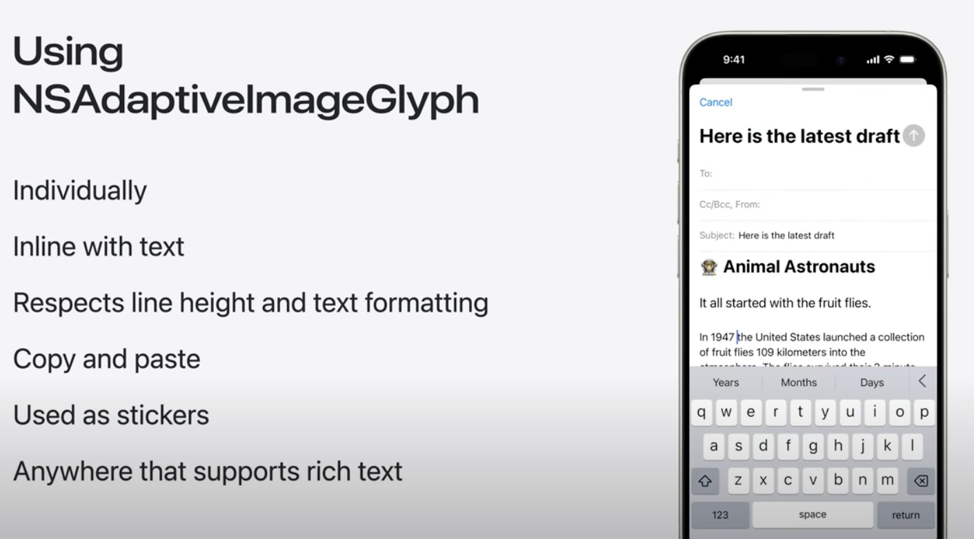 콘텐츠 편집이 가능한 WebView 및 SwiftUI 텍스트를 포함한 모든 Apple 플랫폼에서 기존 UI 텍스트 및 요소의 이미지 문자 모양을 지원하는 것 외에도 TextKit 및 CoreText와 같은 기존 Apple 프레임워크로 구축된 사용자 정의 텍스트 엔진은 업데이트 된 텍스트 렌더링 API를 활용해 제공할 수 있음. Genmoji를 위한 맞춤형 솔루션 제공 가능.