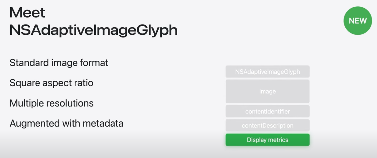 NSAdaptivelmageGlyph는 여러 해상도의 정사각형 가로세로비(종횡비)의 표준 이미지 형식으로 구동되며, 전역적으로 고유하고 안정적인 식별자, 접근성(Acessibility)에사용할 수 있는 컨텐츠에 대한 설명, 적절한 레이아웃과 배치를 허용하는 정렬 측정항목과 같은 메타데이터로 강화