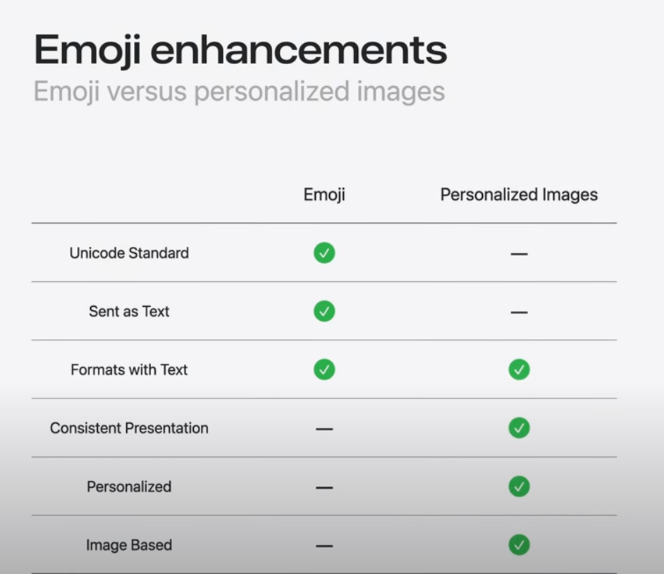 - 반면 Genmoji같은 개인화 된 이미지는 유니코드 텍스트 문자로 설명할 수 없는 고유한 rasterized(래스터) 된 비트맵.