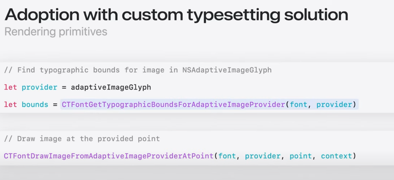 CoreText는 현재 글꼴의 메트릭을 기반으로 적절한 인쇄 범위를 쿼리할 수 있는 적응형 이미지 Provider로 NSAdaptiveImageGlyph를 사용하는 방법을 제공.