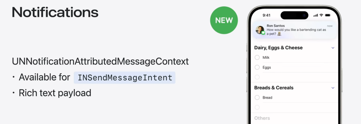 새로운 "UNNotificationAttibuted MessageContext API"를 사용하여 알림에 Genmoji 및 기타 이미지 문자를 포함할 수 있음.