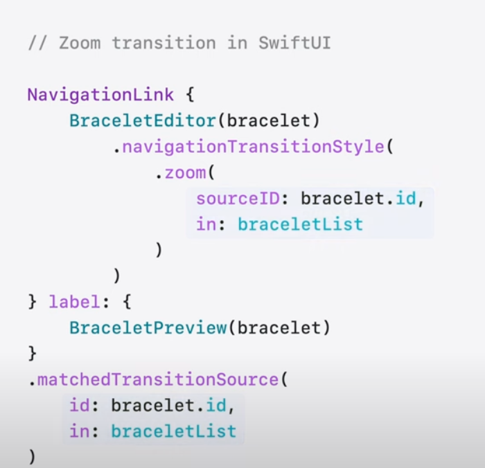 navigationTransitinStyle, matchedTransitionSource에 nameSpace를 추가해서 SwiftUI가 화면 전환시 어떤 뷰와 함께 이동하는지를 알 수 있음.