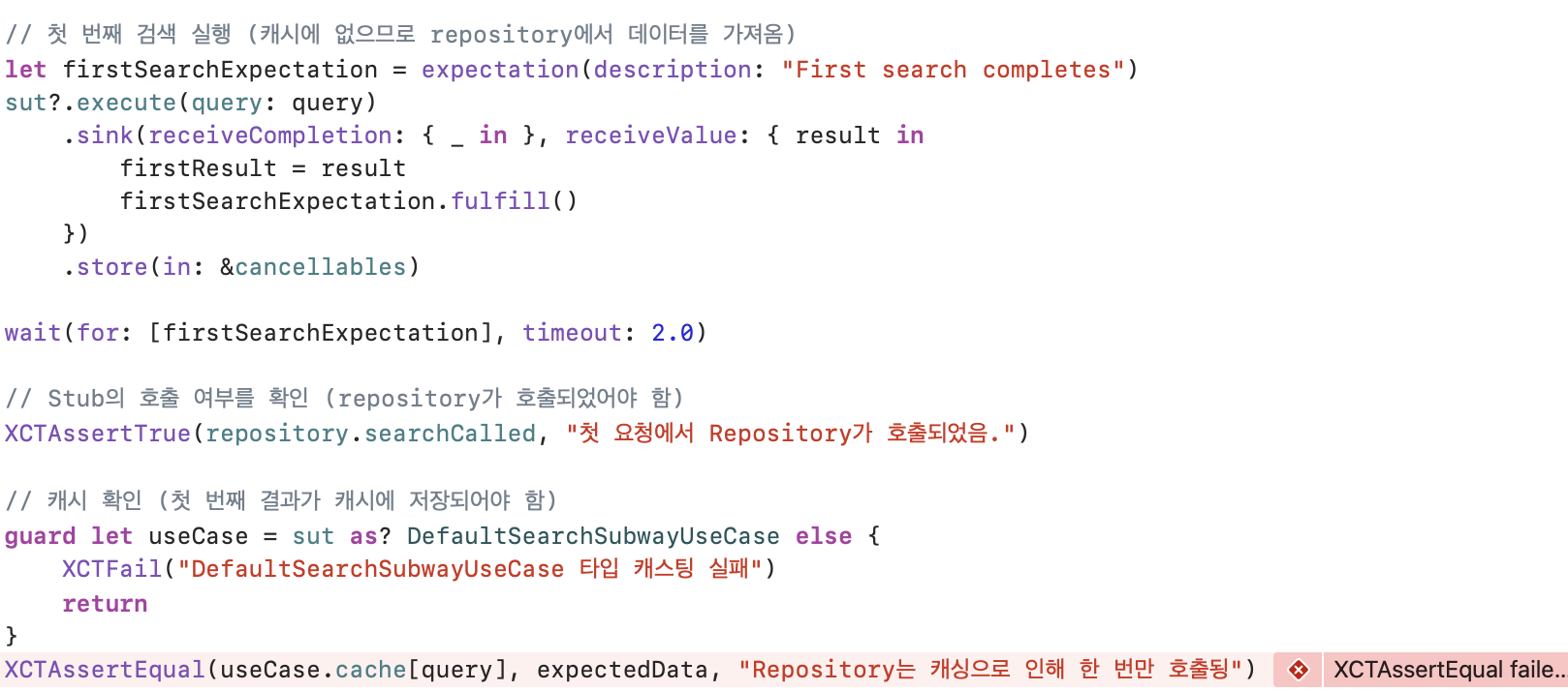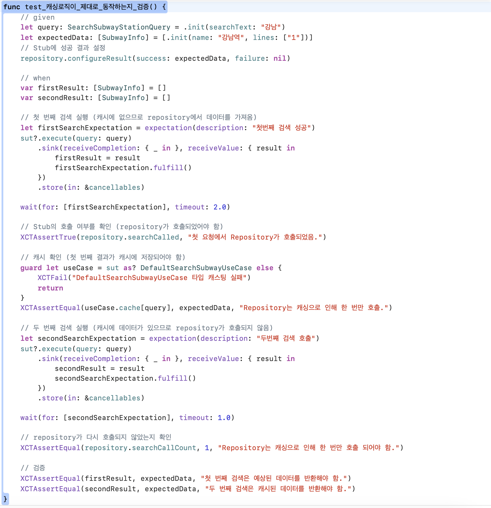 - SearchSubwayUseCaseTests 캐싱 로직 동작 검증 코드