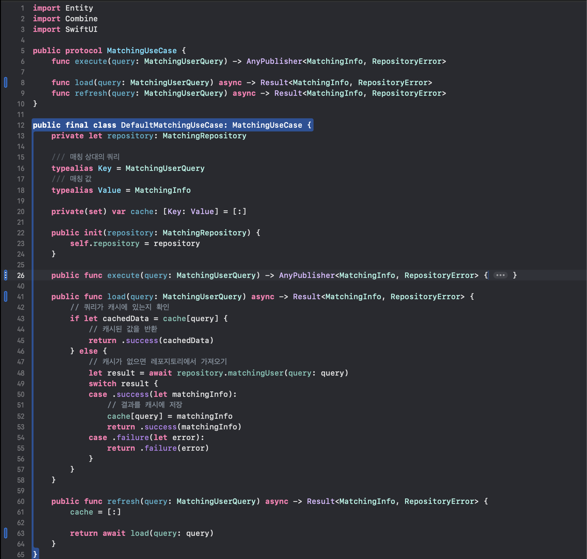 기존 코드는 캐싱을 위해 캐시 프로퍼티가 존재하며, Combine을 기반으로 작성되어 있었음.