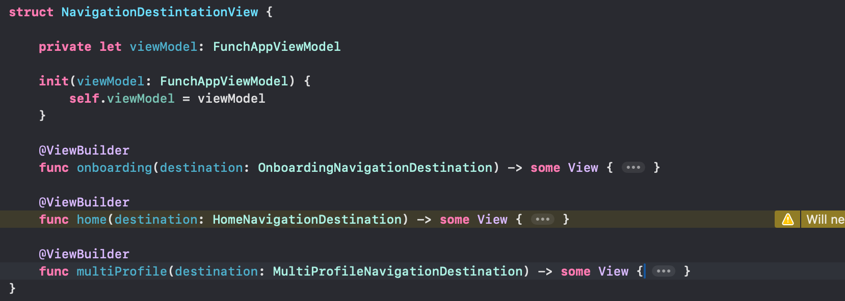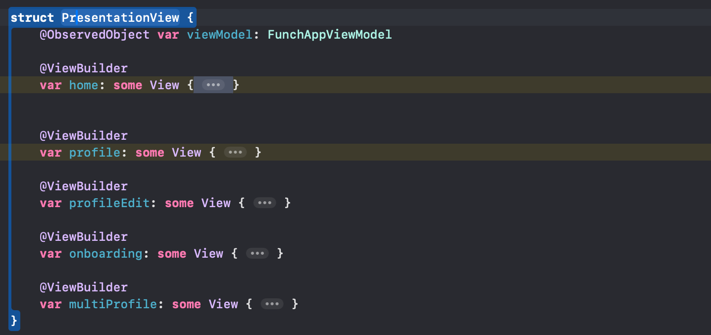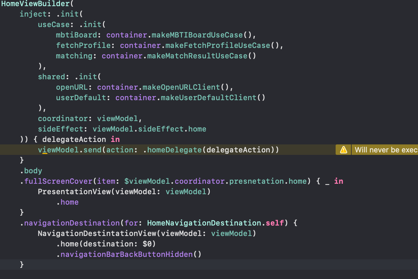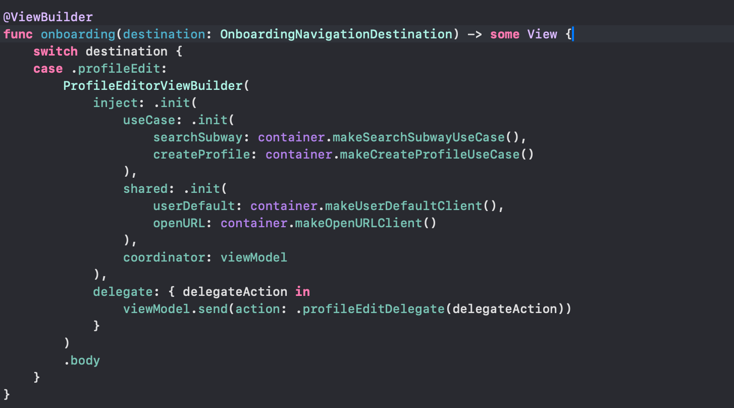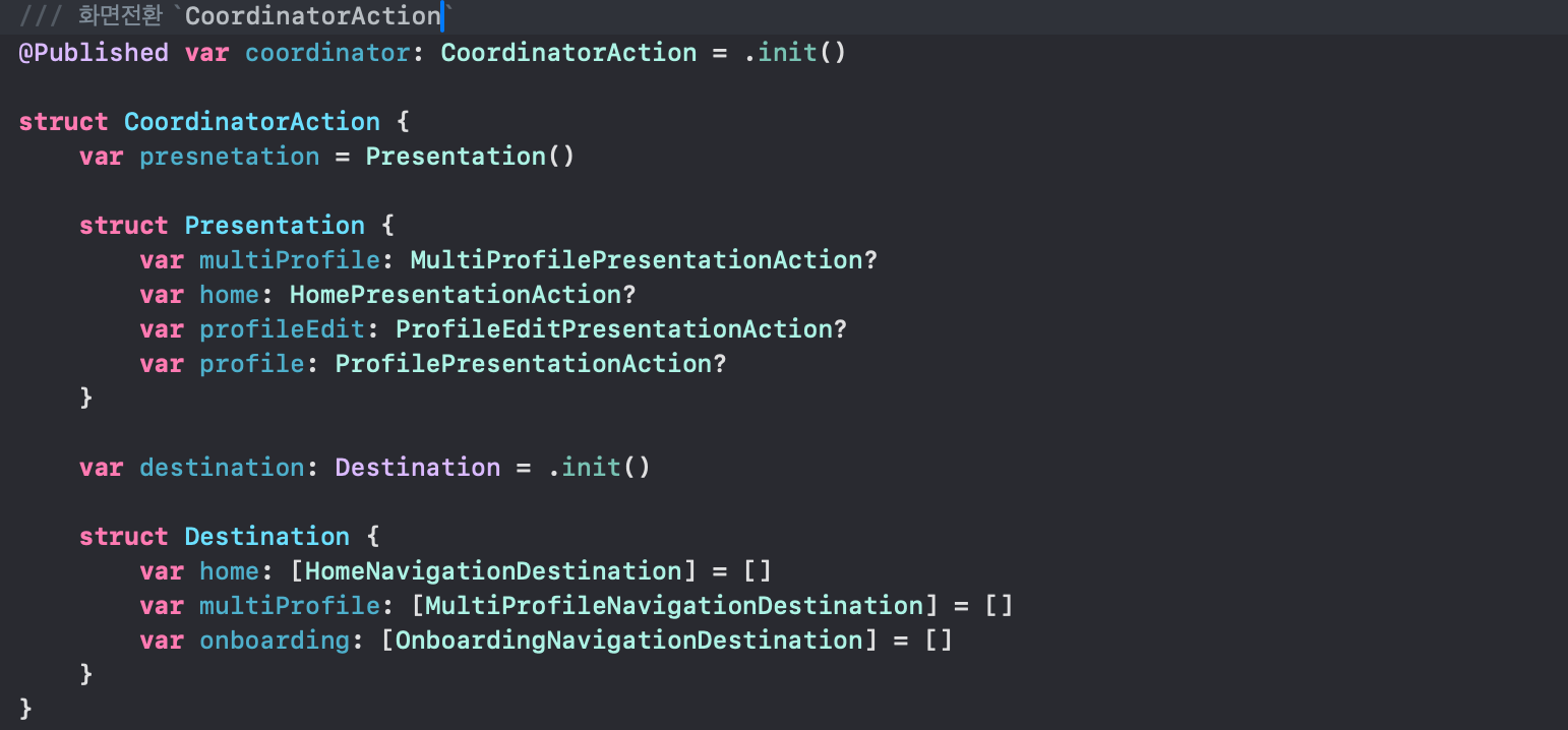 이후 화면전환과 관련한 struct를 만든 후 presentation 및 detination에 따라 경로를 처리할 수 있도록 아래 코드처럼 세팅