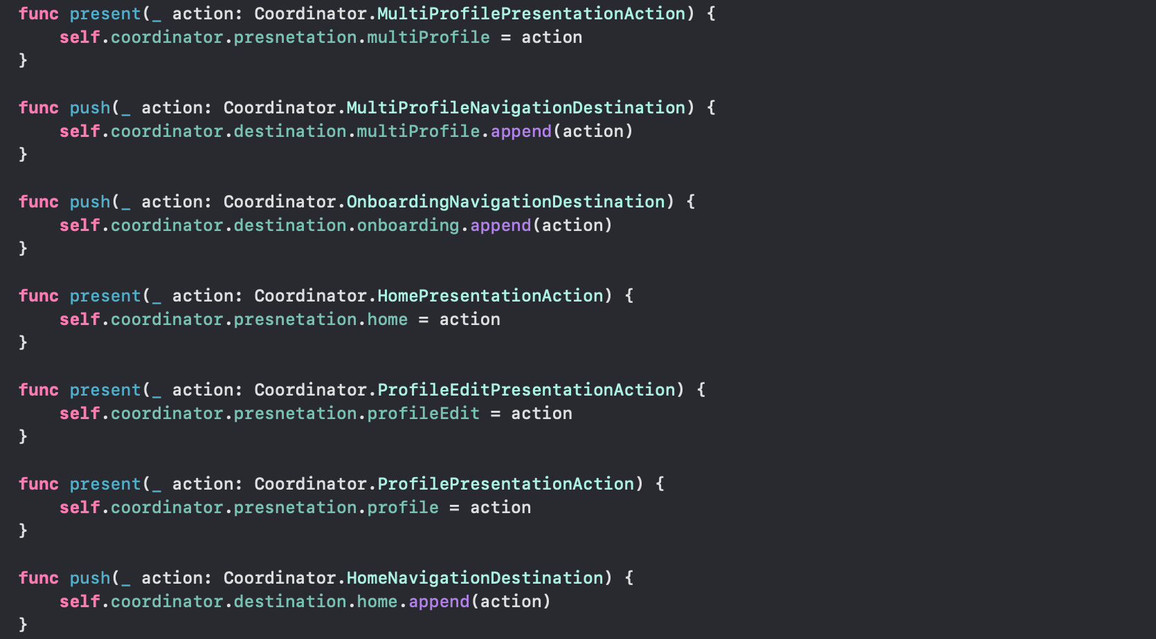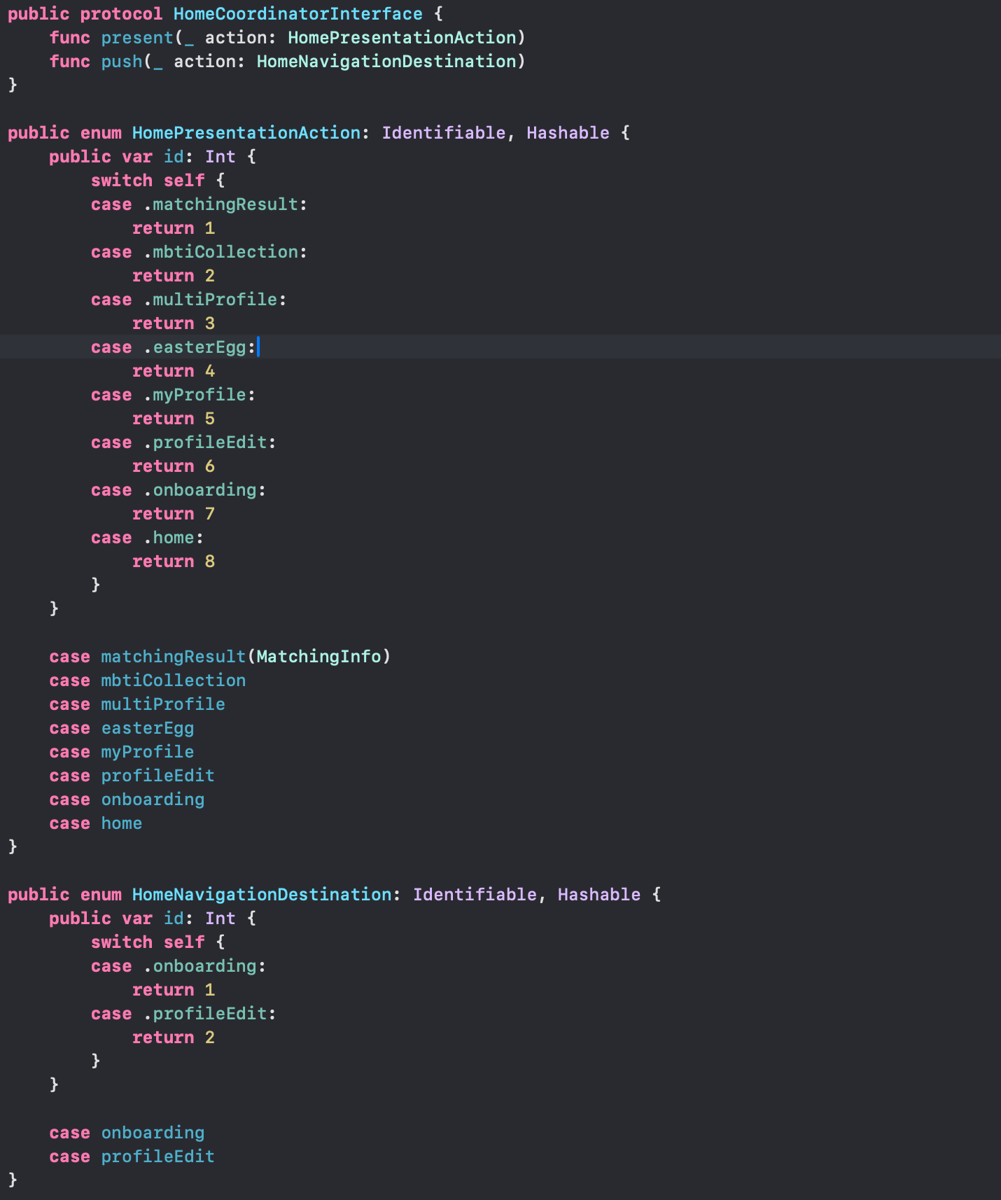Coordinator 인터페이스를 프로토콜로 선언하고, 각 화면 전환 방식에 따라 이동할 수 있는 방법을 enum으로 지정