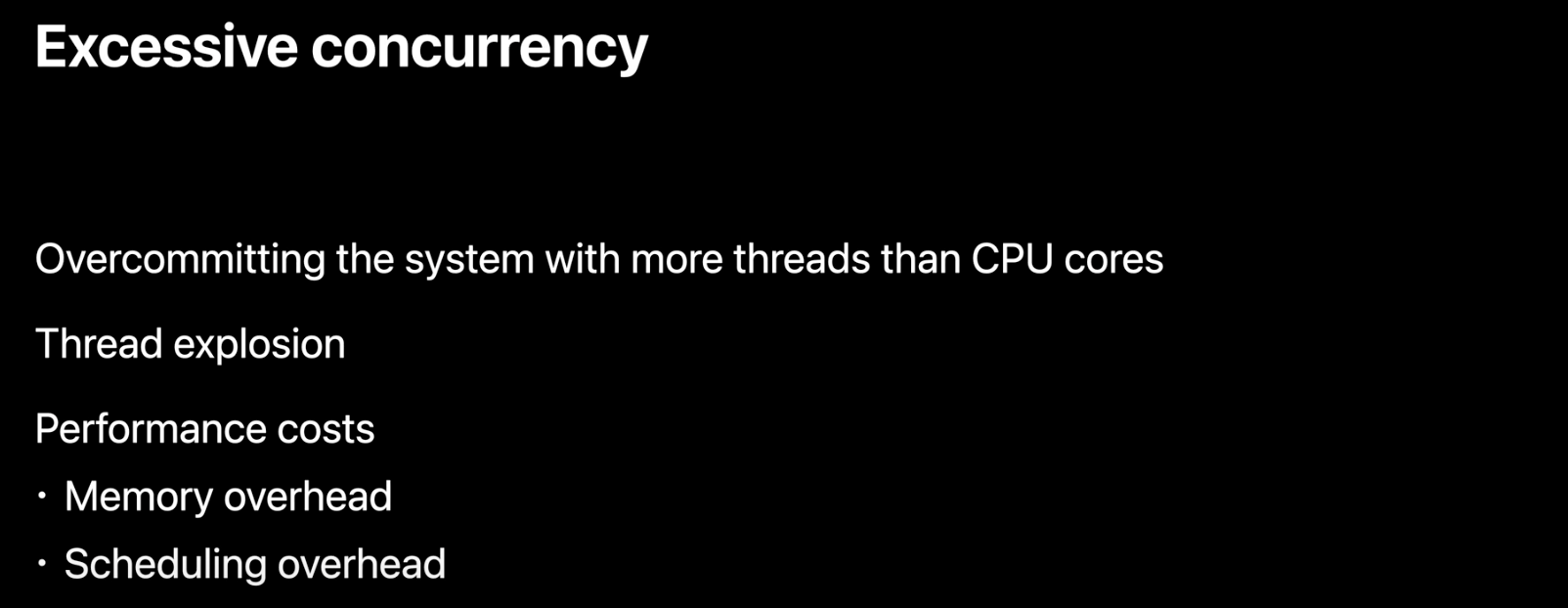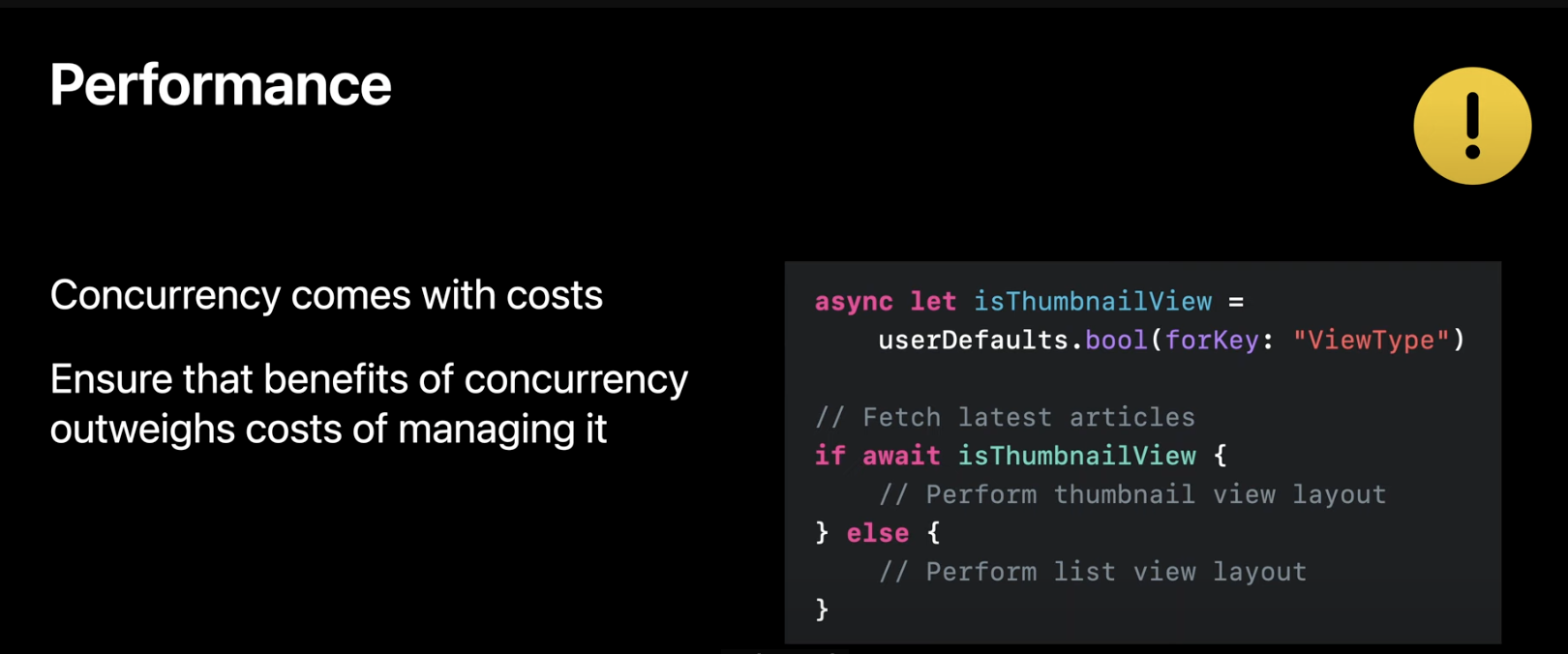 따라서 코드에 Concurrency 도입하는 비용이 동시성을 관리하는 비용보다 클 때만 Swift 동시성을 사용하여 새 코드를 작성하도록 주의해야 함.