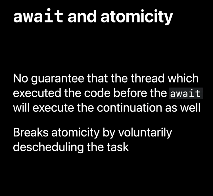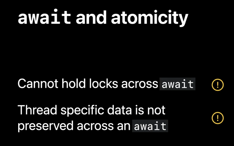 마찬가지로 스레드별 데이터는 await에서도 보존되지 않음. 스레드의 지역성을 기대하는 코드의 모든 가정은 await의 동작을 설명하기 위해 다시 검토해야 함.