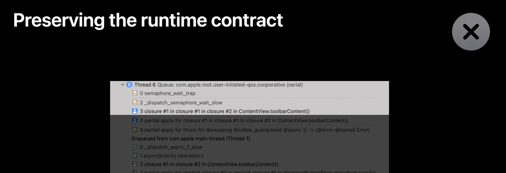 마지막 고려 사항은 Swift의 효율적인 스레딩 모델의 기반이 되는 Runtime Contract와 관련이 있음.