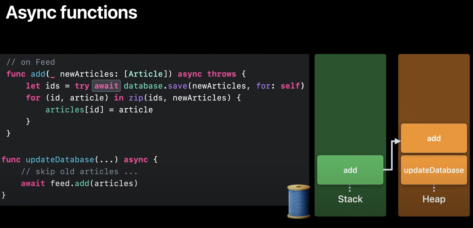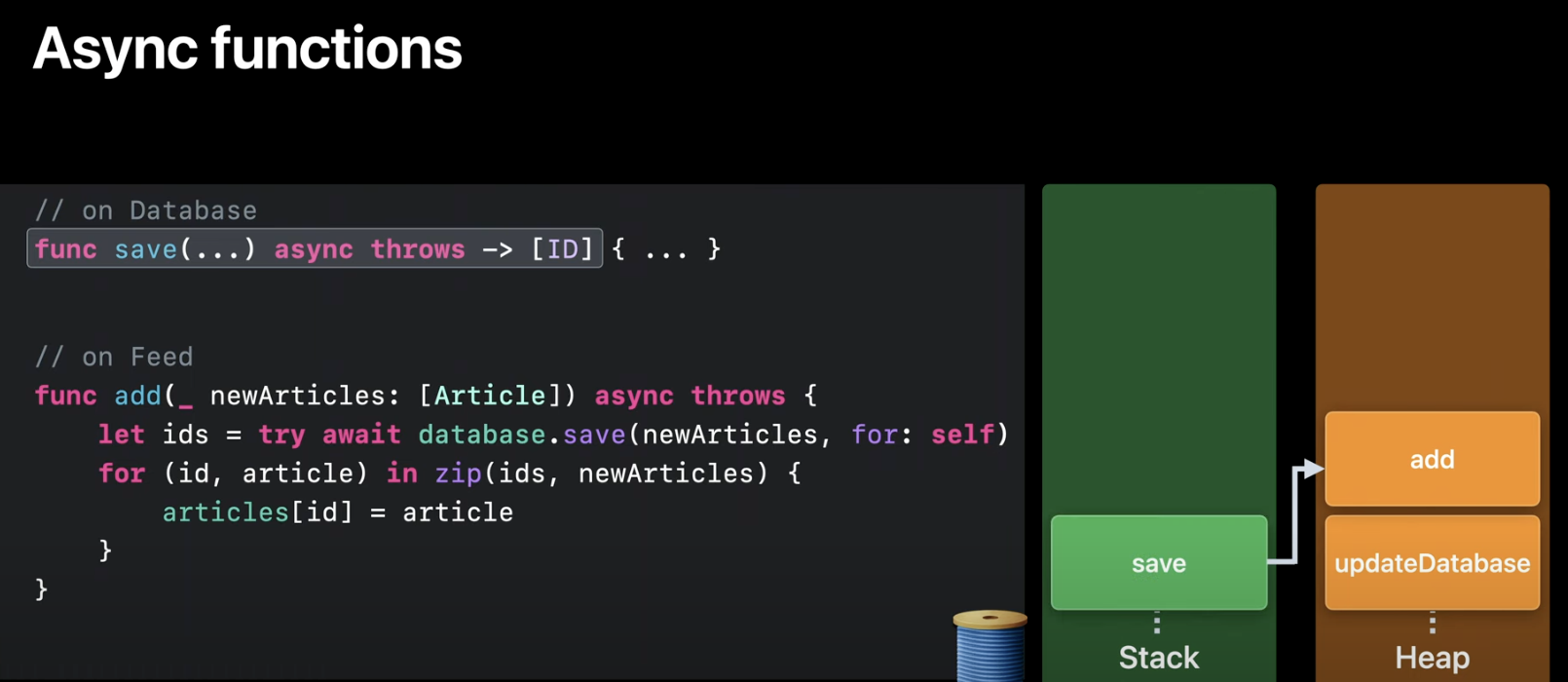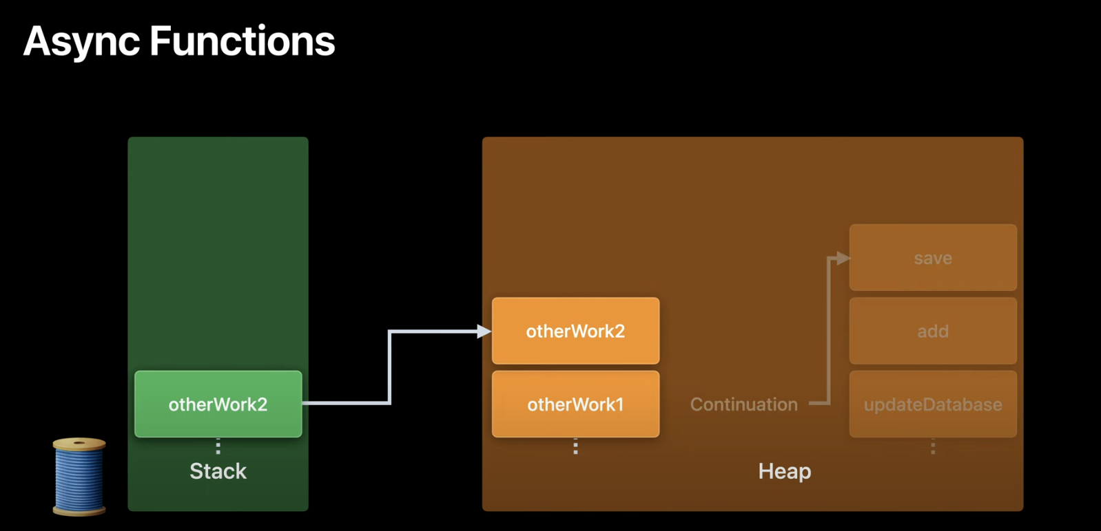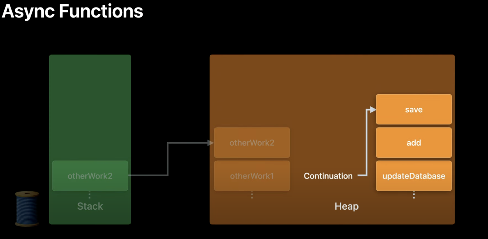 첫 번째는 await의 의미론에서 비롯되고, 두 번째는 Swift Runtime에서 작업 종속성을 추적하는데서 비롯함.