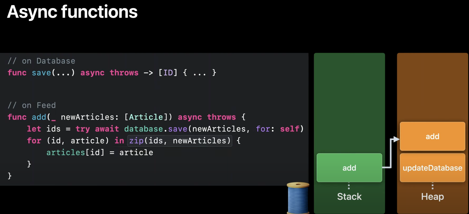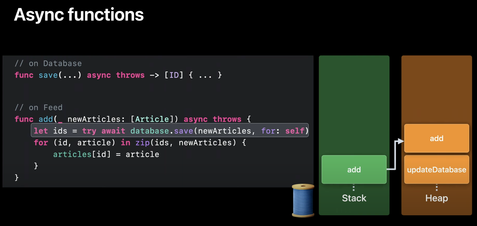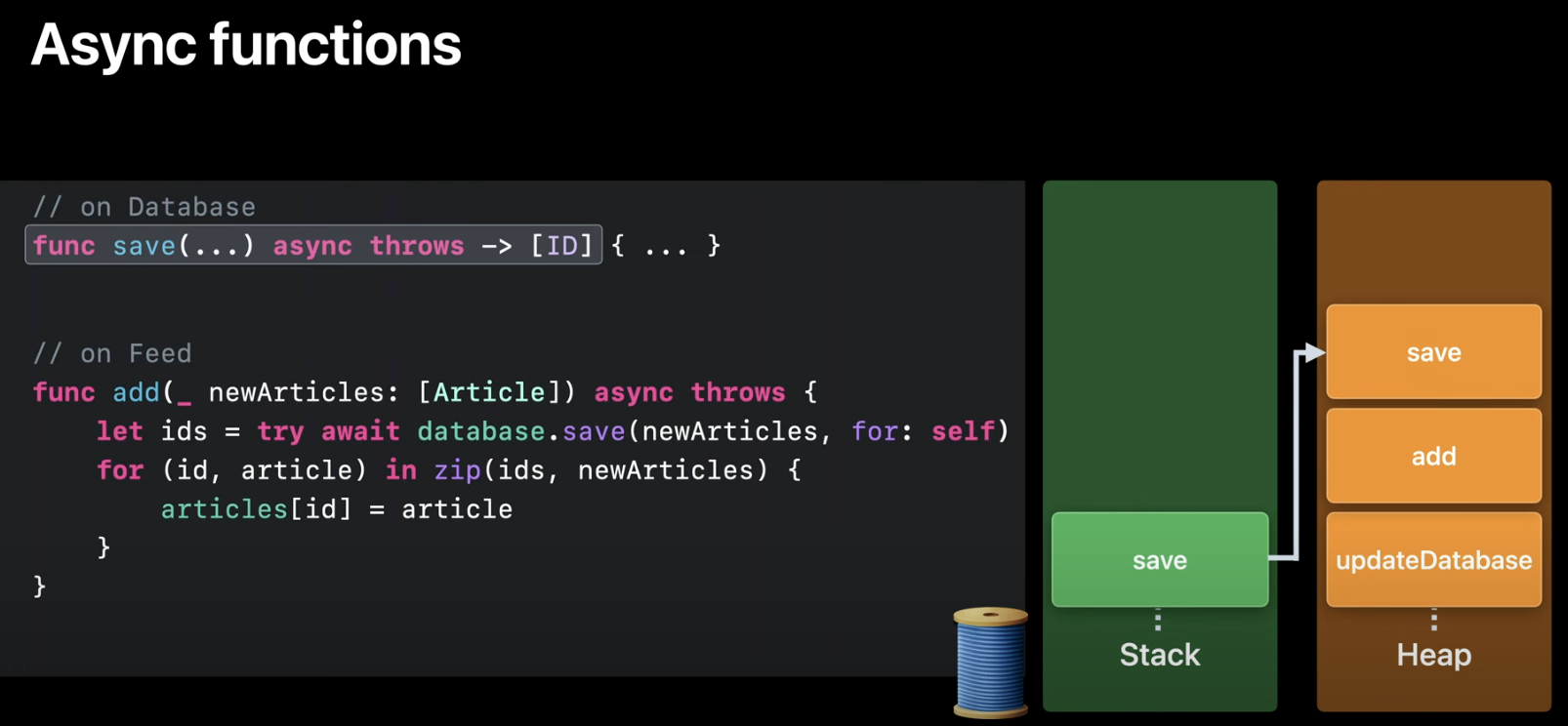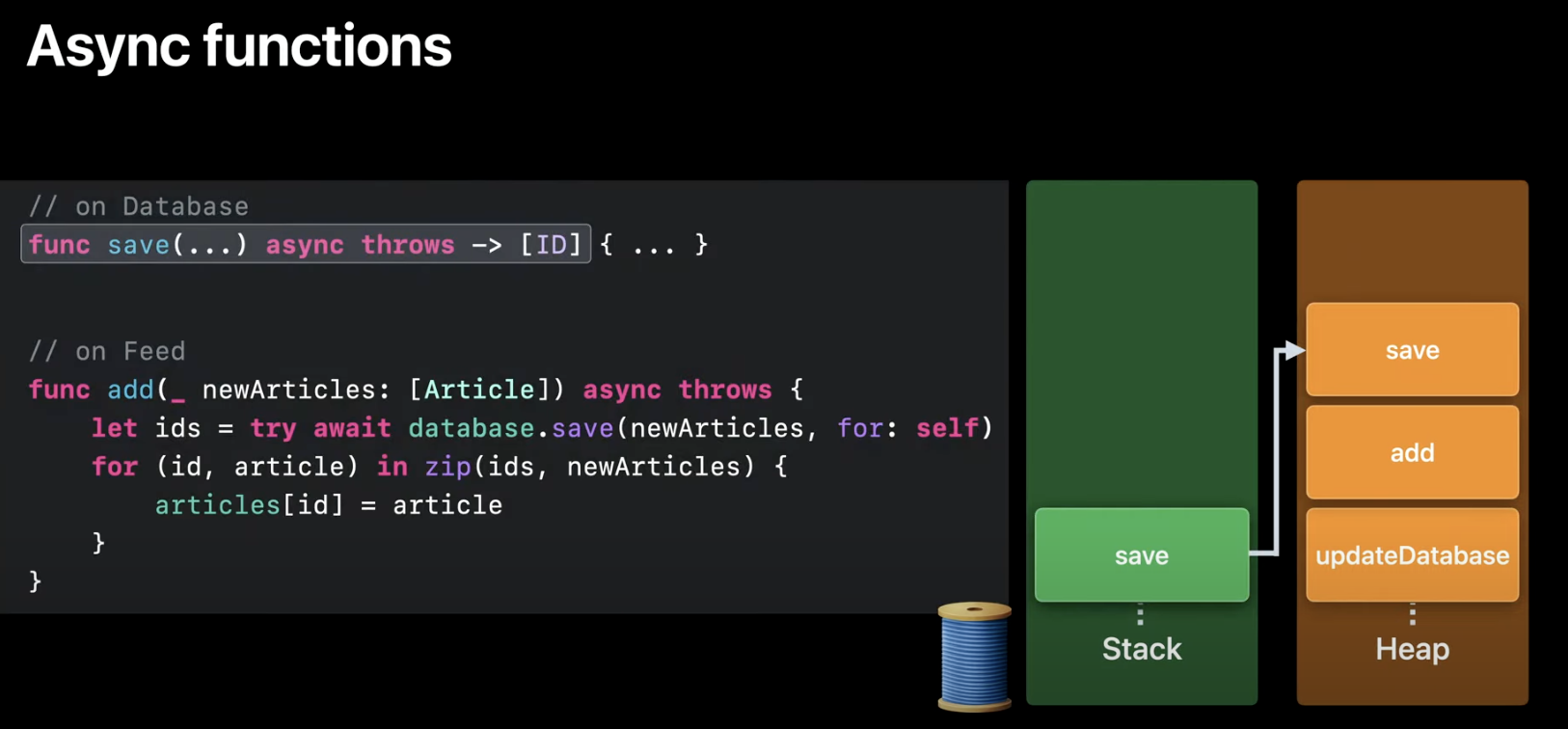 첫 번째는 await의 의미론에서 비롯되고, 두 번째는 Swift Runtime에서 작업 종속성을 추적하는데서 비롯함.
