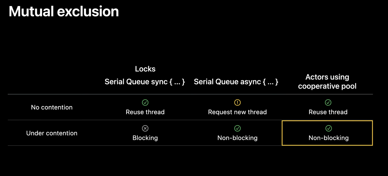이러한 문제로 인하여 Swift 언어에서 동시성을 설계할 때 다른 방식을 취했음.