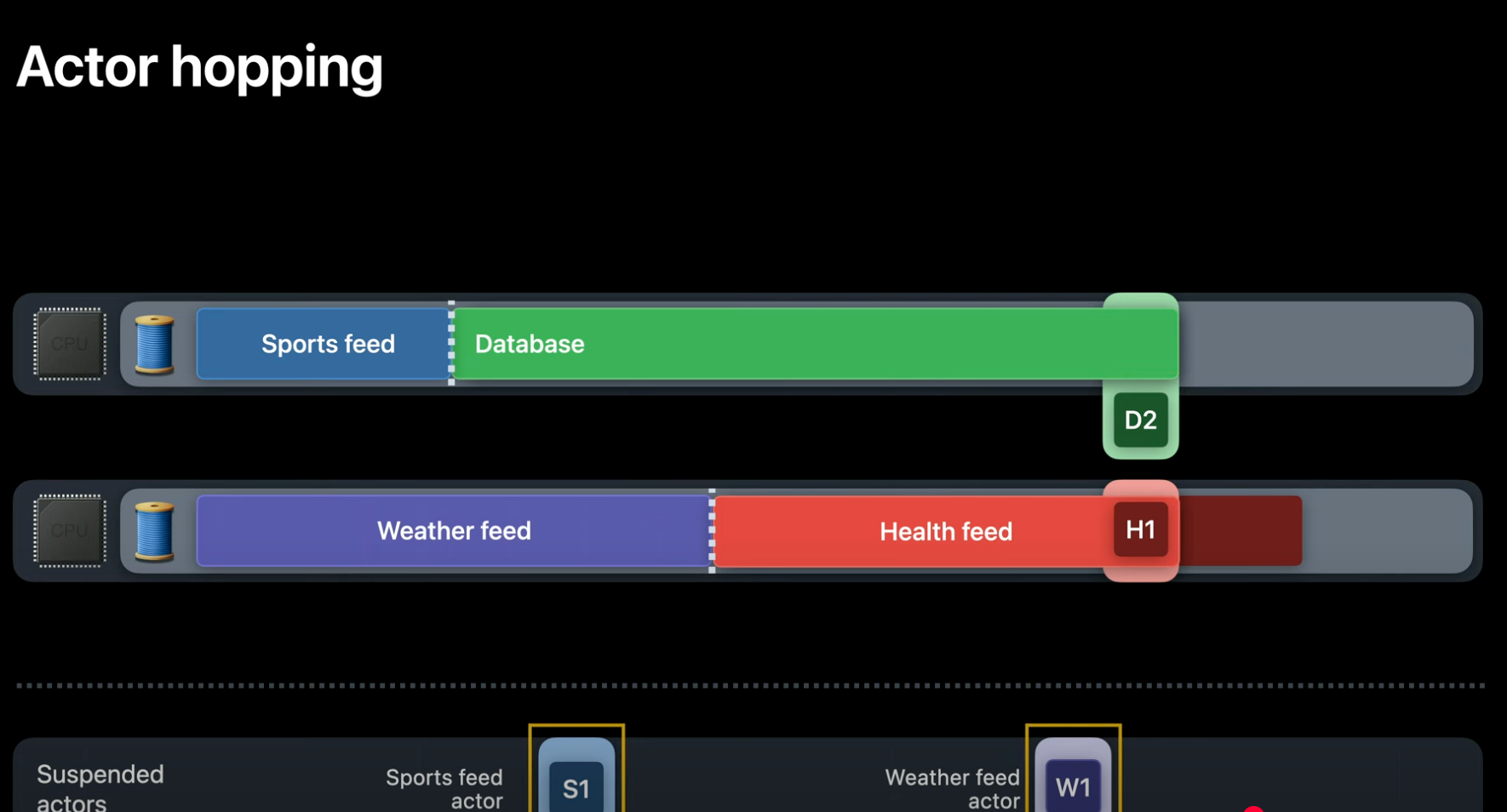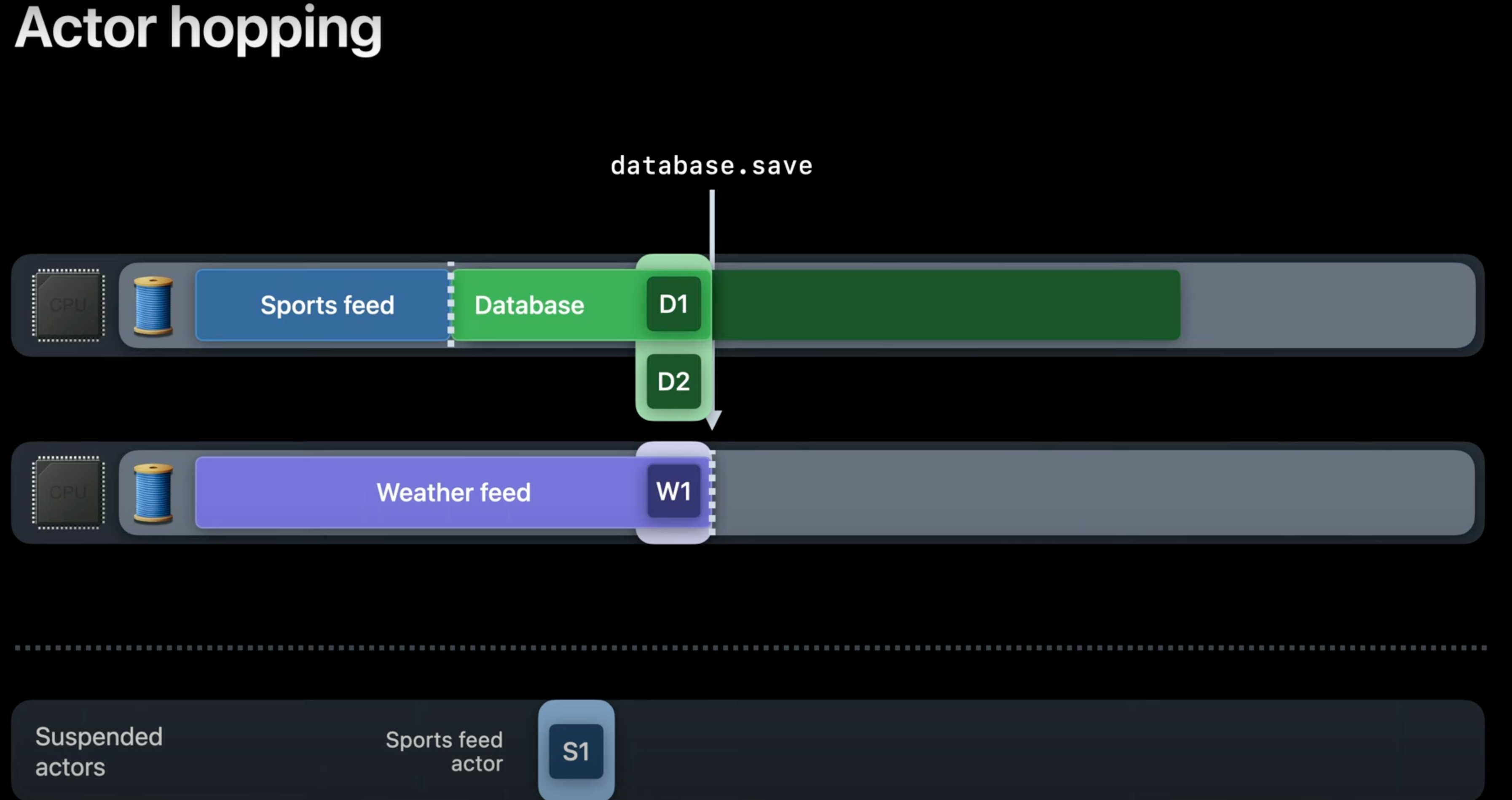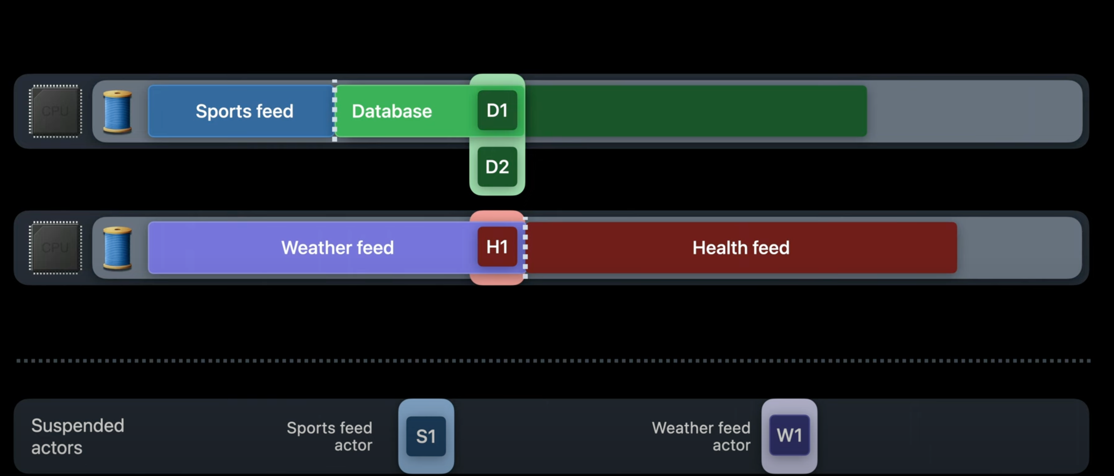 잠시 후 초기에 들어온 데이터베이스 작업이 종료되면, D2를 실행할 수 있게 되며 해당 스레드에서 서스펜션 된 actor 중 하나를 선택해 재개할 수도 있음.