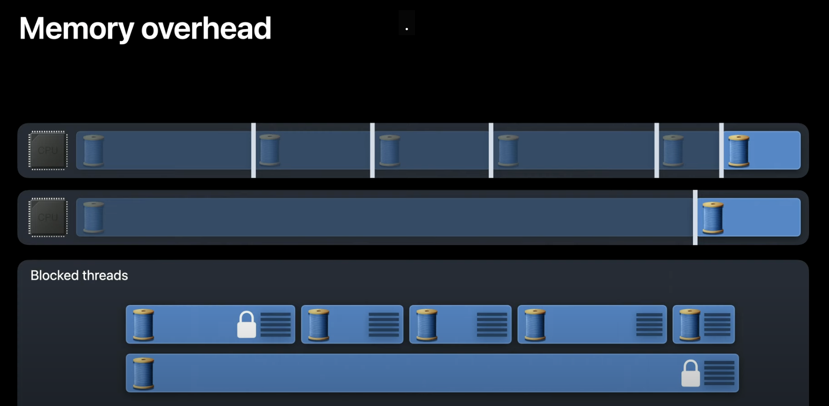 이로써 함수 호출 비용만 지불하면 되며, Swift Runtime에서 스레드는 CPU 코어 수만큼의 스레드만 생성하고, 스레드가 차단되었을 때 작업 항목 간에 저렴하고 효율적으로 전환할 수 있도록 함.
