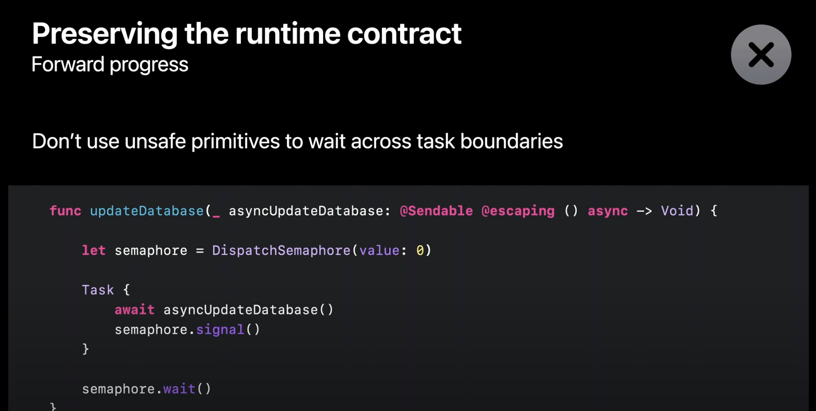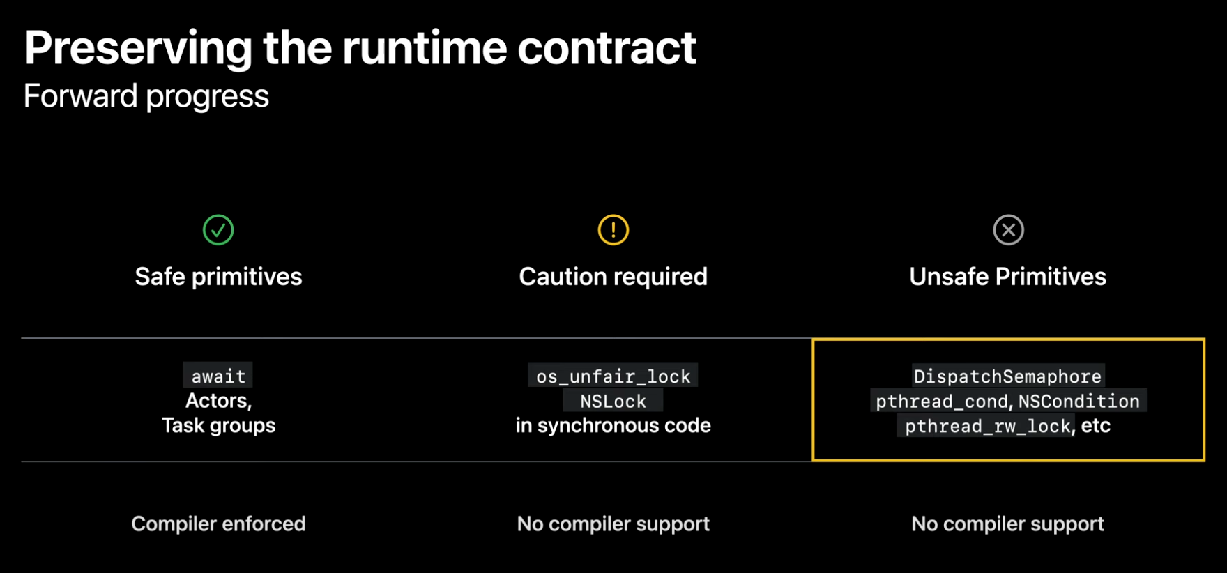 - 따라서 함수는 경합 중에 짧은 시간 동안만 스레드를 차단할 수 있지만, 이는 진행 상황에 대한 Runtime Contract를 위반하지 않음. 하지만, Swift Concurrency의 기본 요소들과 달리 lock을 사용하는데, 컴파일러의 도움을 받지 못하며, 개발자의 책임임.