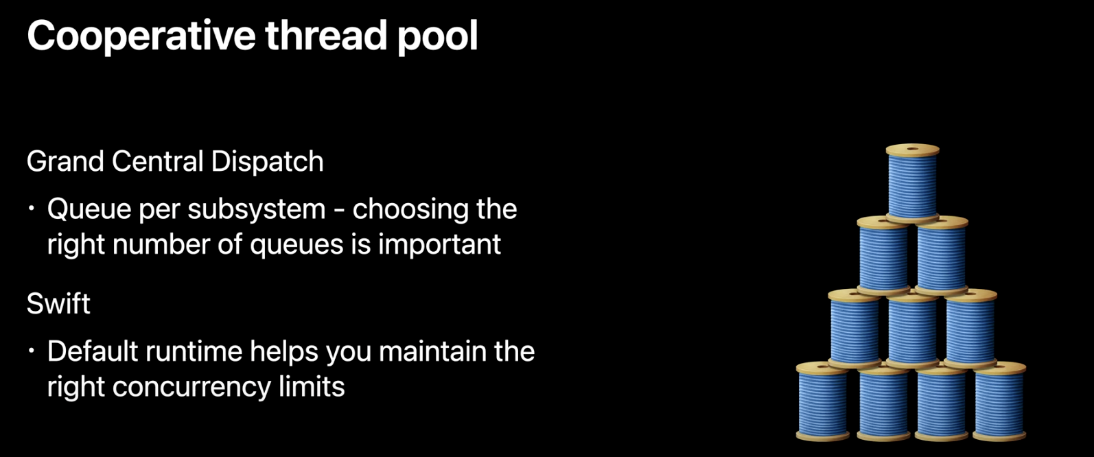 작업 항목이 차단되면 더 많은 스레드를 생성하는 GCD와 Concurrent Queue와 달리Swift는 항상 블락하지 않고 진행할 수 있음.