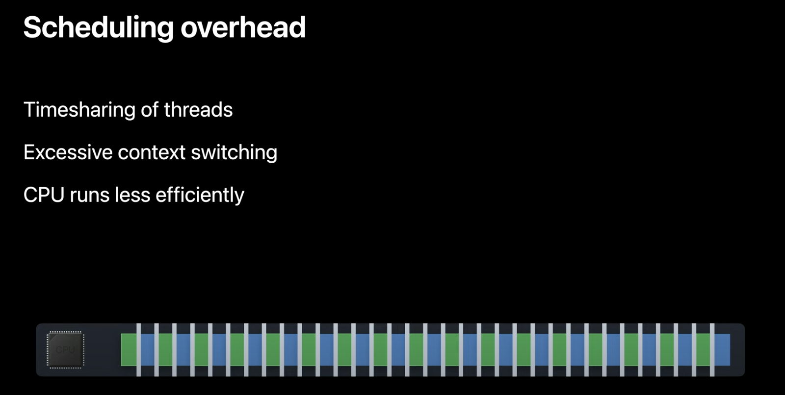 이 지점이 바로 동시성의 힘이지만, 스레드 폭발이 발생하면 제한된 코어를 가진 장치에서 수백 개의 스레드를 타임셰어해야 하므로 과도한 컨텍스트 전환이 발생할 수 있음.