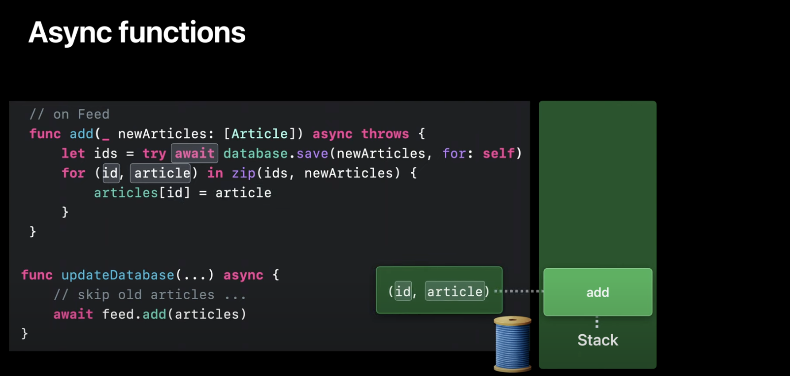 await이라고 표시된 이 지점에서는 로컬 변수인 ids와 atricles는 정의된 후 중간에 중단 지점 없이 for 루프의 본문에서 즉시 사용됨.